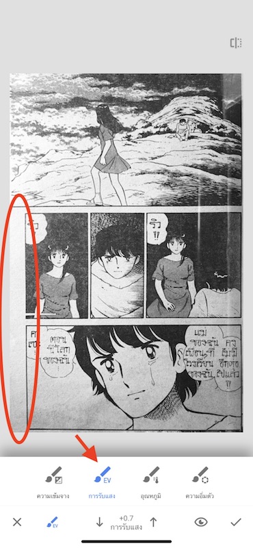 สังเกตุดูที่ขอบภาพด้านซ้ายจะมีสีคล้ำๆ ตรงจุดที่วงไว้ ตรงนี้เราแก้ได้ด้วยคำสั่ง "แปรง" แล้วเลือกที่ "EV การรับแสง" จัดการป้ายลงไปเลย