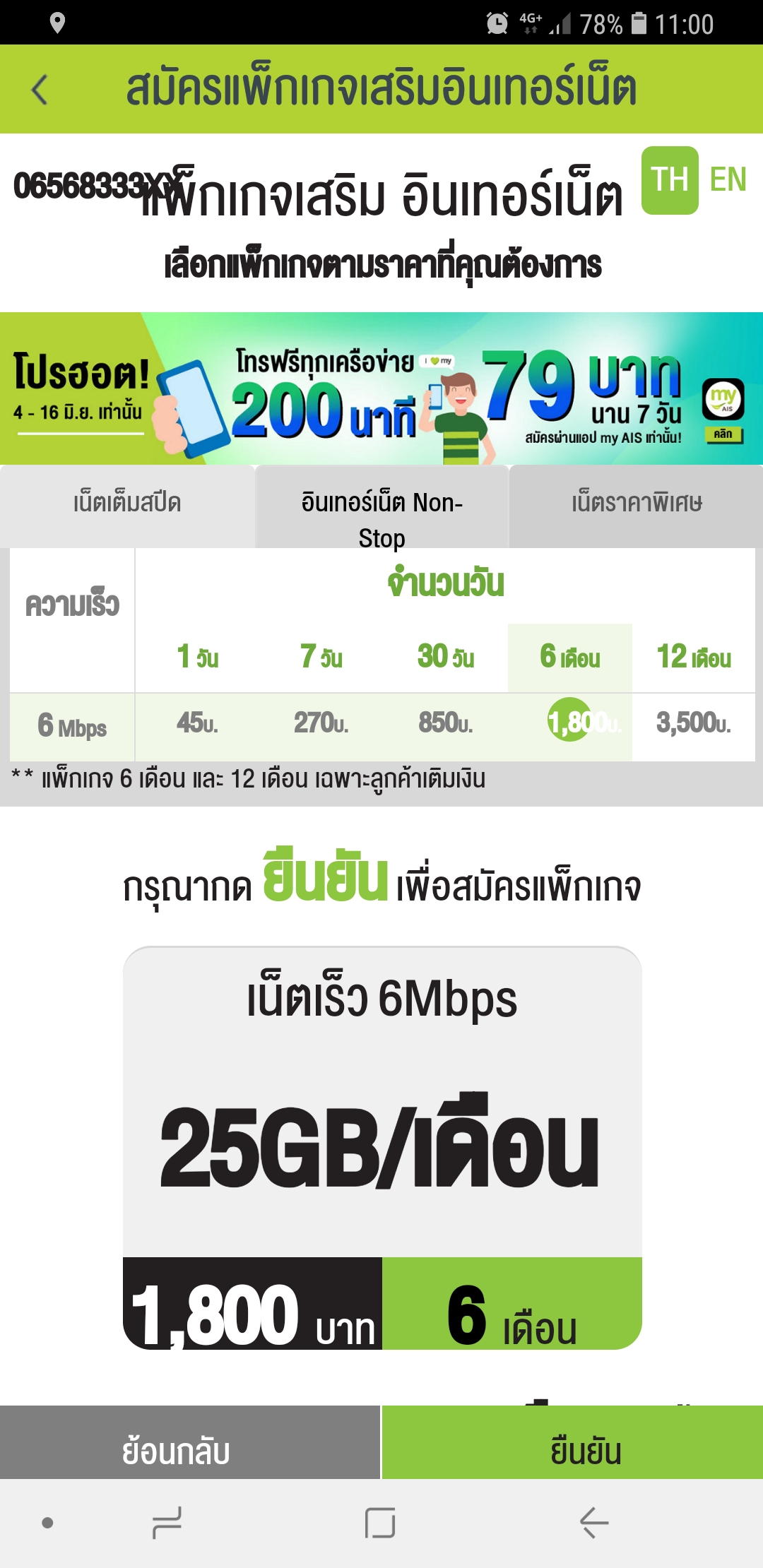 เพิ่งจะหมดโปรเน็ตเหมาจ่ายของ Ais 1,400 บาท /6เดือน ที่ความเร็ว 4 mbps ไม่จำกัดปริมาณ(ไม่ลดสปีด) คิดเฉลี่ยต่อเดือนคือ 233 บาท แต่ตอนนี้โปรปัจจุบันได้จำกัดปริมาณแล้ว ยกตัวอย่าง โปรเหมาจ่าย 1,800 /6เดือน ที่ความเร็ว 6 mbps ได้ปริมาณเดือนละ 25 GB ซึ่งมันไม่เพียงพอต่อการใช้งาน
