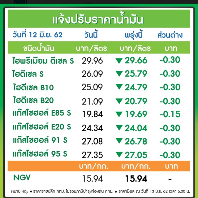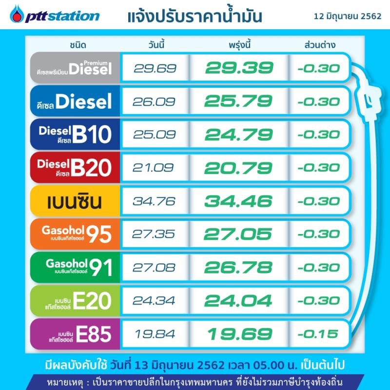 โดยน้ำมันพีทีที อัลตร้าฟอร์ซ ดีเซล, ดีเซลพรีเมียม, พีทีที อัลตร้าฟอร์ซ ดีเซล B10 และ ดีเซล B20 รวมทั้งน้ำมันกลุ่มเบนซินและแก๊สโซฮอล์ทุกชนิด ปรับลดราคาลง 30 สตางค์/ลิตร เว้น E85 ปรับลด 15 สตางค์/ลิตร มีผลวันพรุ่งนี้ (13 มิ.ย. 2562) ตั้งแต่เวลาตี 5 เป็นต้นไป
