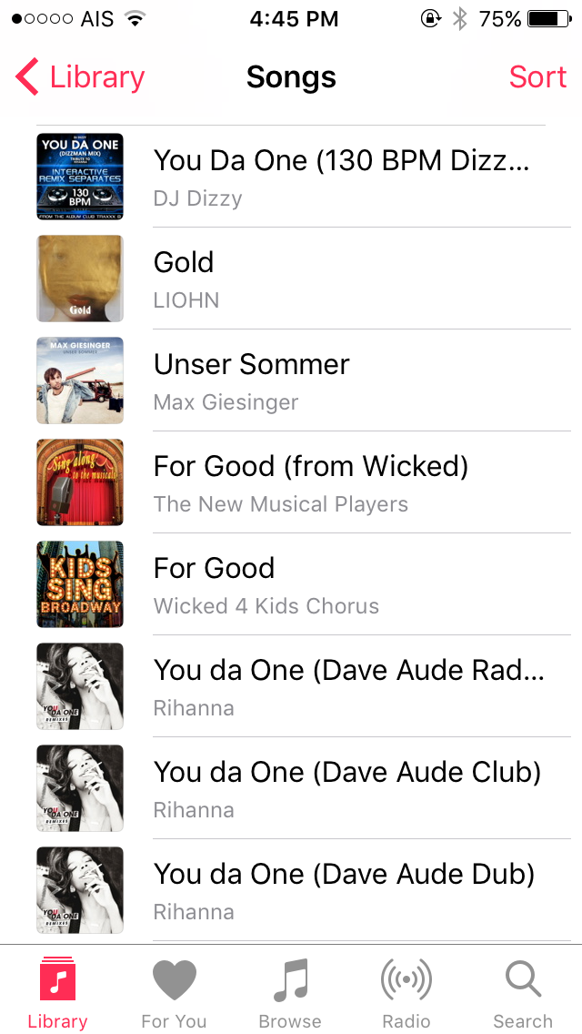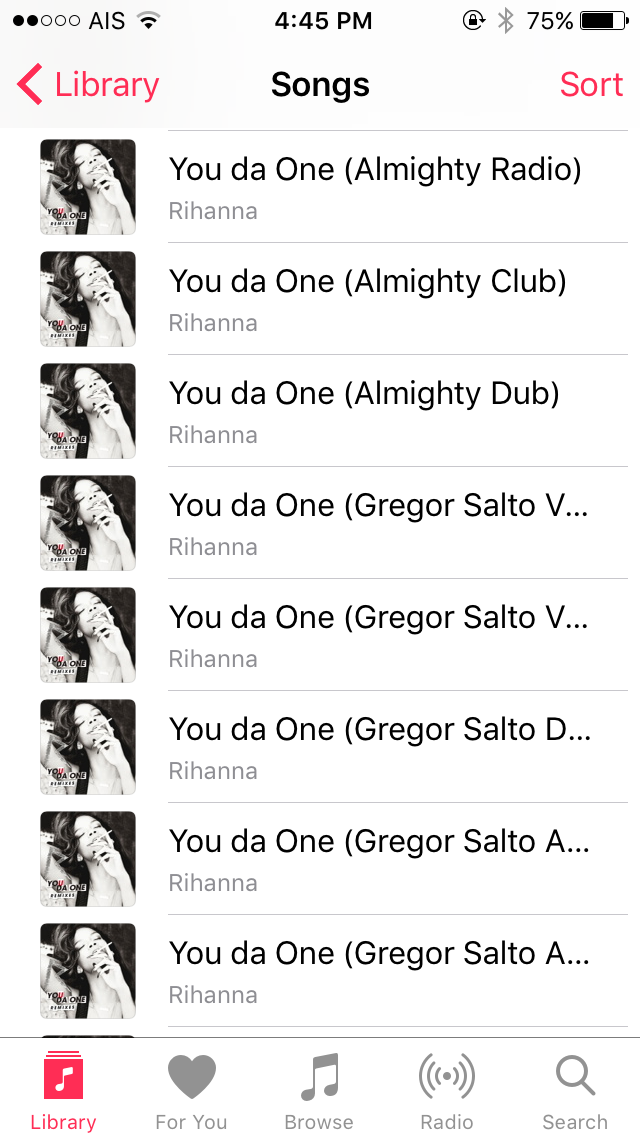 นี่คือคลังเพลงใน itunes เครื่องดั้งเดิมที่เรามีอยู่ มีอยู่หลายสิบเพลง แต่บนเครื่องใหม่ๆ กลับเหลืออยู่แค่ 5 เพลงแรก ที่เหลือคือหายไปไหน เพราะว่าเราซื้อมาทั้งนั้น