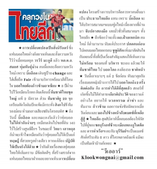 ว่ากันด้วยเรื่องของฟุตบอลไทยให้เต็มคราบ มีข้อคิดดีๆ ที่สร้างสรรค์จากแฟนบอลไทยมาฝากและอยากเห็น การเปลี่ยนแปลง โครงสร้างการบริหารคือควรหาคนอื่นมาเป็น ประธานไทยลีก แทน เพราะ บิ๊กอ๊อด จะได้บริหารสมาคมฯแบบฟูลไทม์ เนื่องจากที่ผ่านมา จับปลาสองมือ เลยมั่วซั่วทั้งสมาคมฯ ทั้งไทยลีก