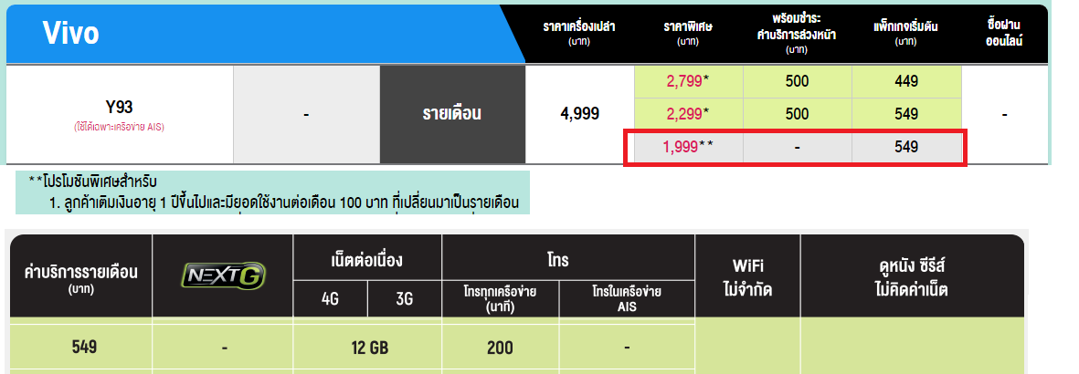 สนใจ Vivo Y93 ลูกค้าเก่าเปลี่ยนเป็นรายเดือน จ่ายรับเครื่อง 1,999 ไม่มีค่าบริการล่วงหน้า แพคเกจรายเดือน 549
