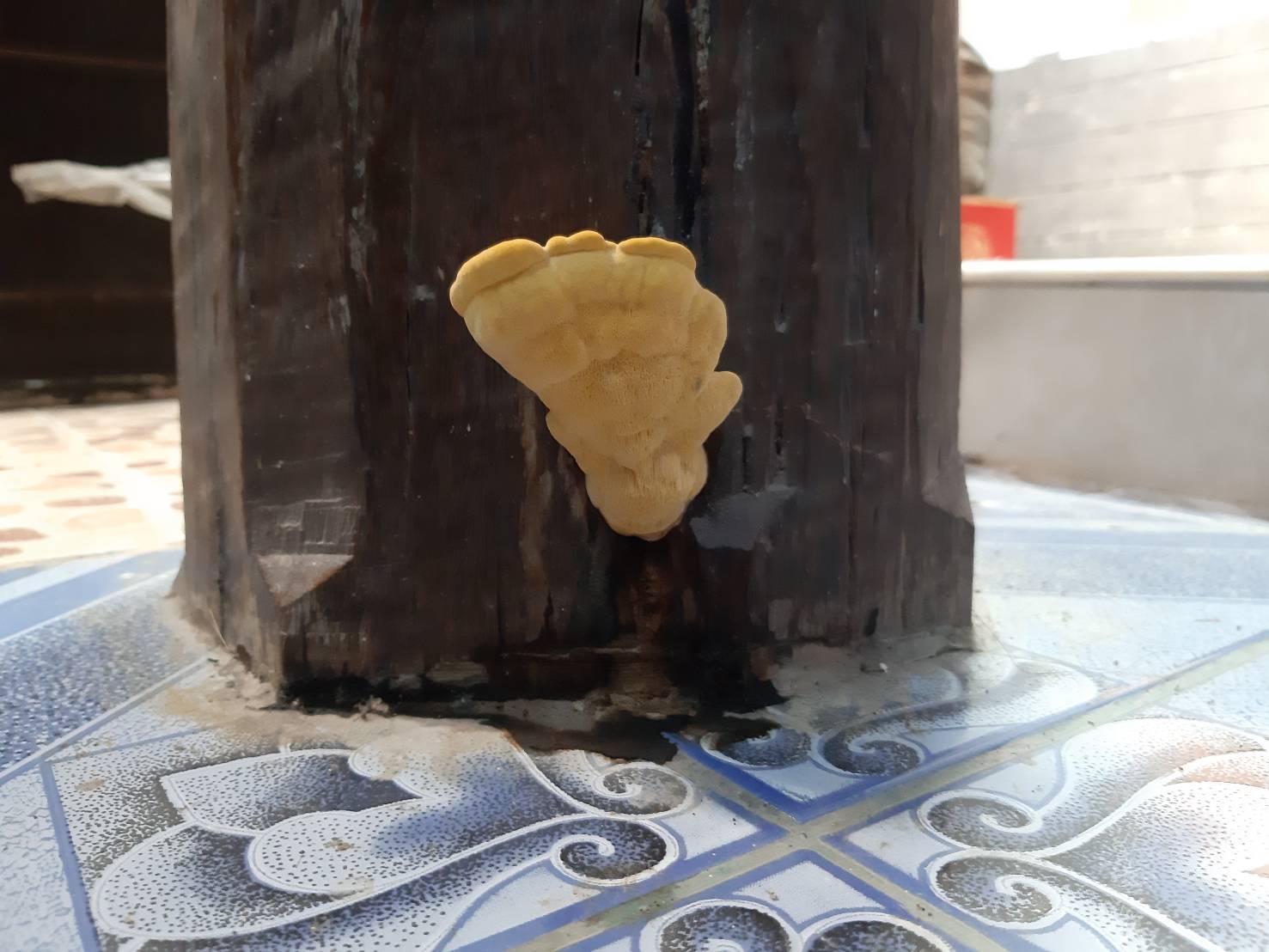 เห็ดขึ้นบนต้นเสากลางบ้านที่ต่างจังหวัด คือ บ้านหลังนี้สร้างมา 30 กว่าปีแล้วค่ะ
