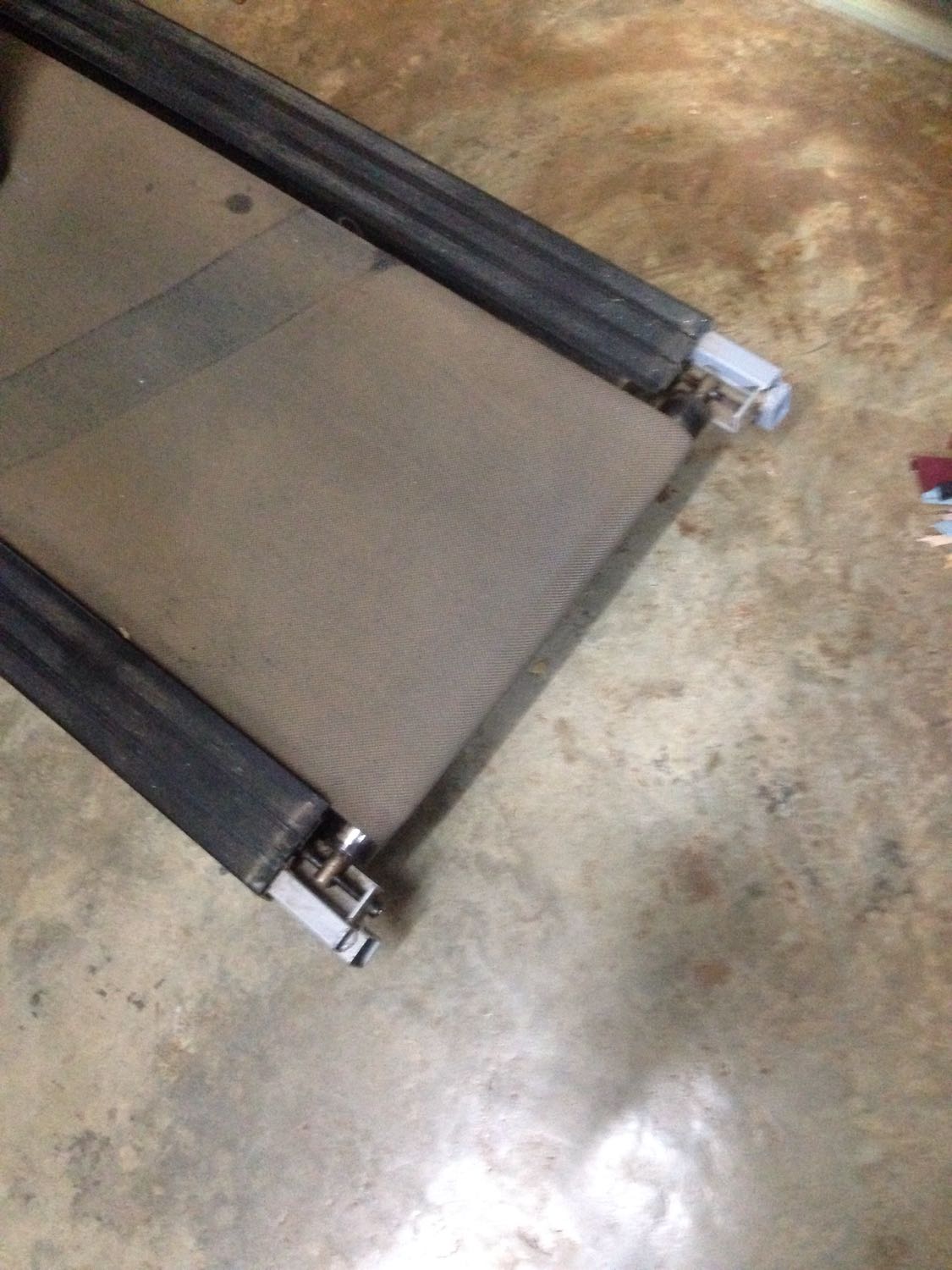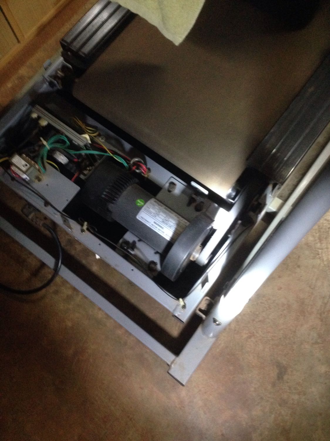หมดประกันแล้วหลายปี ผมถอดมาทำความสะอาด เจอสิ่งนี้เข้า เขาเชื่อมสายไฟโครงเหล้กกับแผ่นรองวิ่ง ที่วัสดุหลักเป็นไม้ แต่วัสดุปิดผิวไม่รู้ว่ามันคืออะไร แต่ด้วยความสงสัยผมลองเอาโอมมิเตอร์วัดแผ่นนี้มันก็ไม่ไ