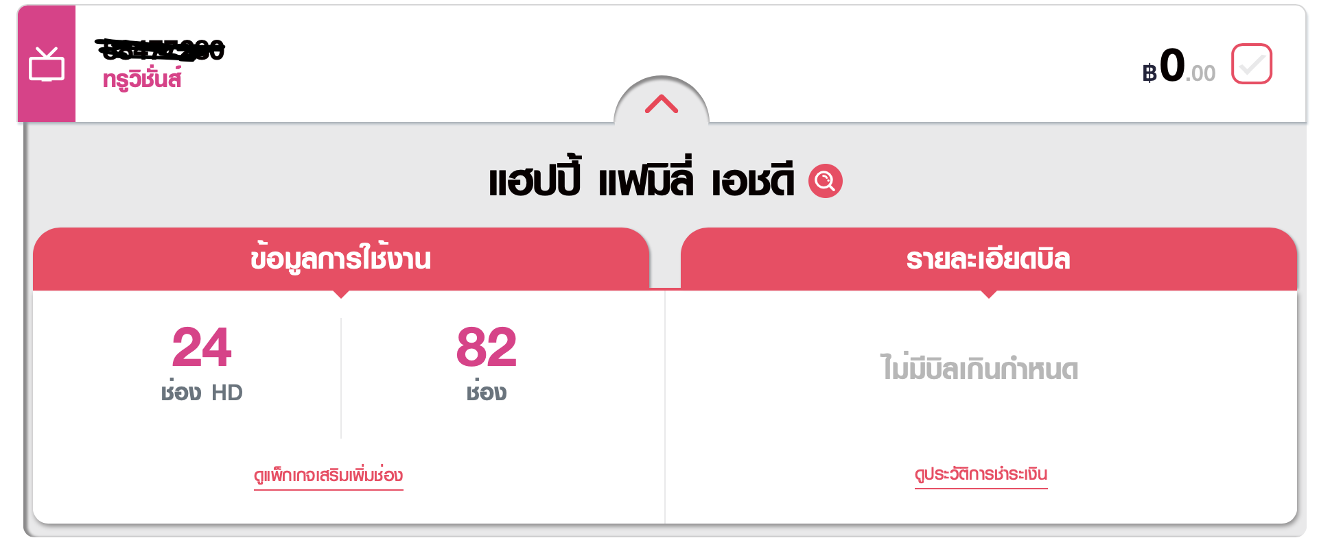 >>> เขาบอกว่าผมไม่สามารถใช้ Pack Happy Family ได้แล้ว เพราะการเปลี่ยนจาก Cable มาเป็น Fiber ไม่ครอบคลุมบริการนี้ ถ้าอยากดูผมต้องจ่ายเพิ่มเดือนละ 100 บาท