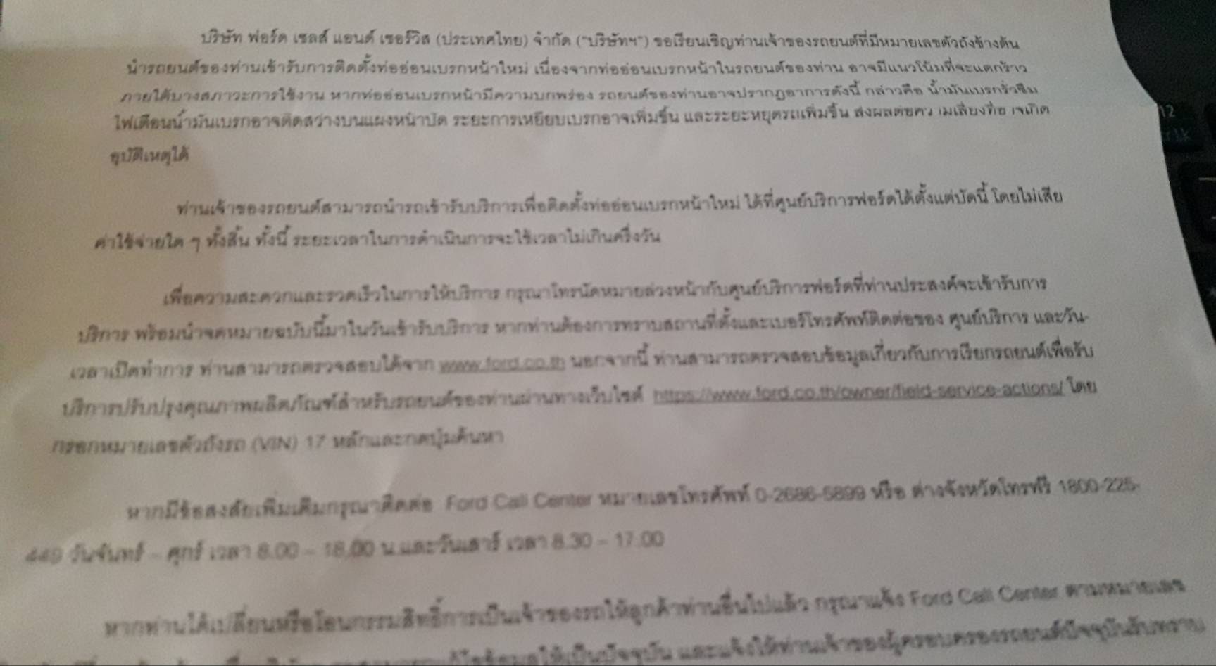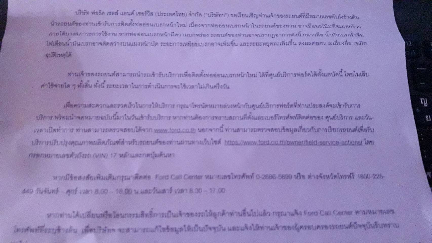 สอบถามหน่อยค่ะ ใครเคยได้รับจดหมายจากฟอร์ดให้ไปเปลี่ยนท่ออ่อนเบรกหน้าบ้างคะ