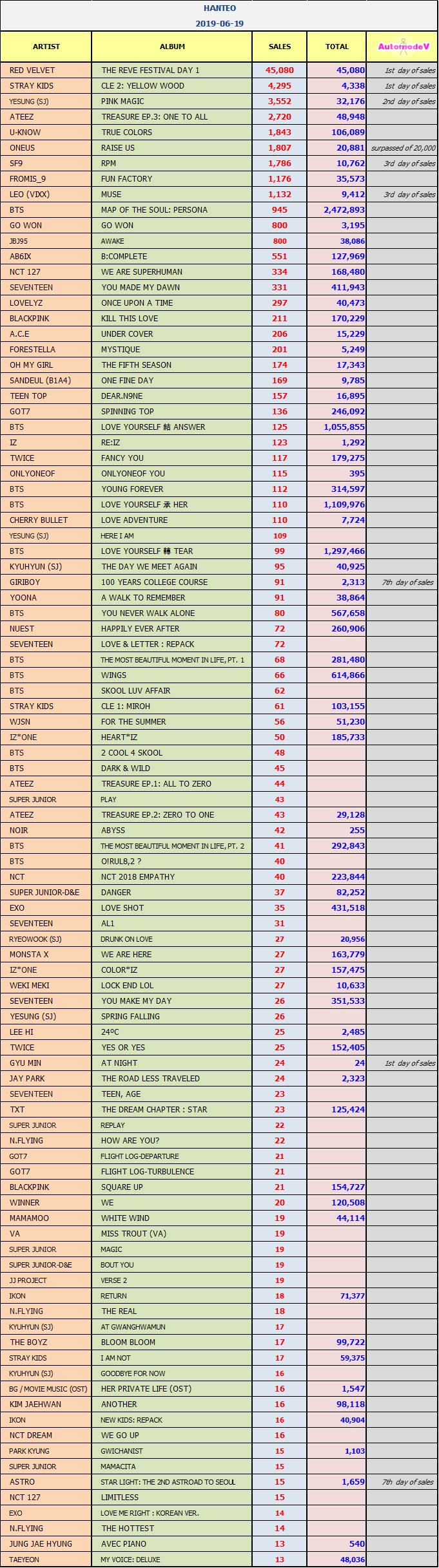 ยอดซื้ออัลบั้มจากชาร์ต HANTEO 19 มิถุนายน 2562 + GIRLGROUPS 1st Day + RED VELVET & STRAY KIDS