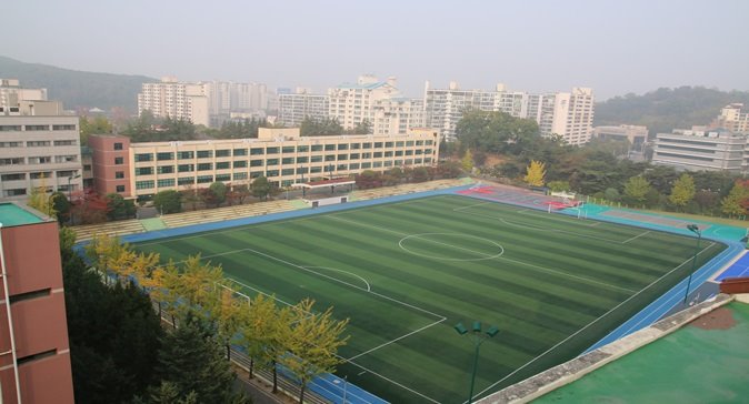 โรงเรียนที่เรียนอยู่คือโรงเรียนมัธยมซังมุน อยู่ย่านกังนัมซึ่งที่ดินแพงหูฉี่แต่สนามกีฬากว้างขนาดนี้ ค่าเทอมคงไม่ต้องพูดถึง