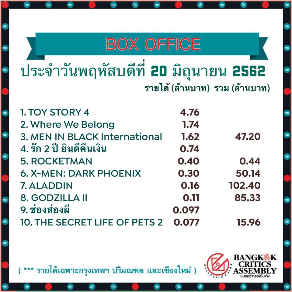 รายได้หนังเข้าใหม่ในไทย 20/6/2562