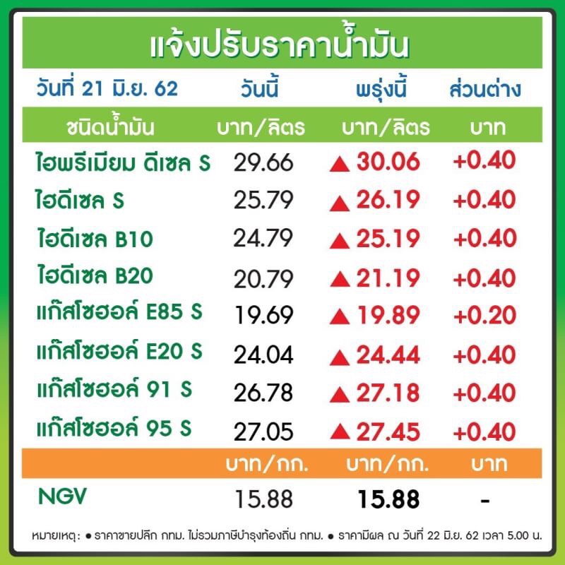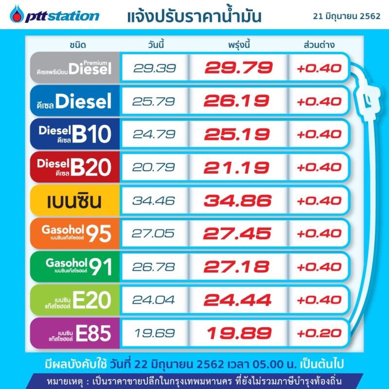 แจ้งปรับราคาน้ำมันทุกชนิด ทั้งกลุ่มเบนซินและกลุ่มดีเซล มีผลวันพรุ่งนี้ (22 มิ.ย. 62) ตั้งแต่เวลาตี 5 เป็นต้นไป