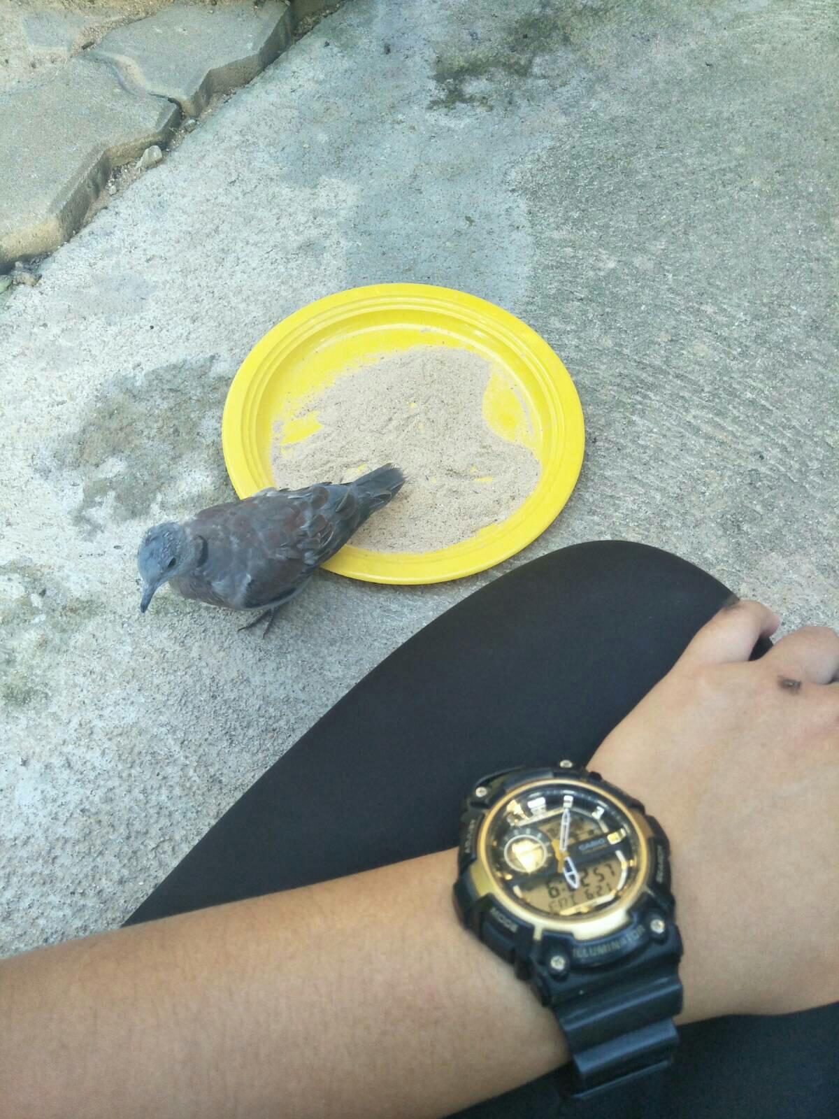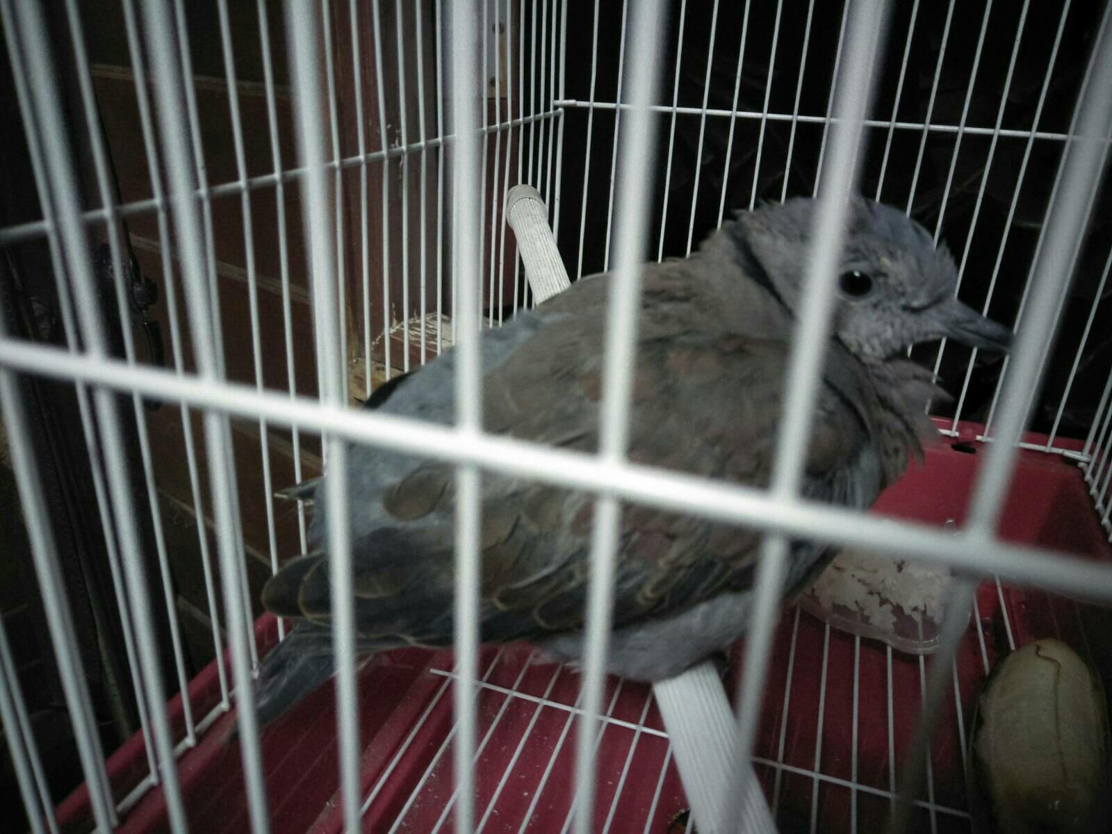 มันมีเส้นดำๆ ตรงคอด้วย กลัวแมวกินเลยจับใส่กรงไว้ก่อน