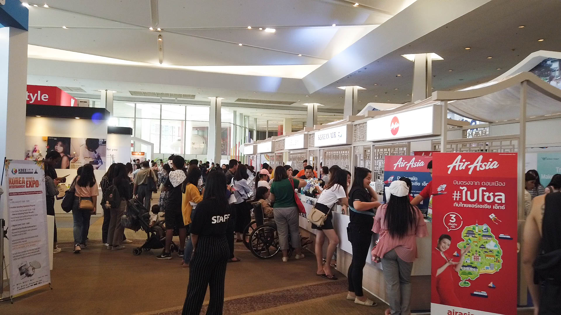 เดินถัดมาอีกหน่อยน่าจะเป็นบูธที่ได้รับความนิยมอย่างมากสุดๆบูธนึงในงานนี้เลย นั่นก็คือบูธของสายการบินต่างๆที่ต่างก็ขนโปรโมชั่นตั๋วเครื่องบินไปเกาหลีมาเรียกได้ว่า ลด แลก แจก แถม กันเลยทีเดียว มีสายการบินต่างๆที่บินไปเกาหลีมากันอย่างครบครัน และทุกๆบูธคนก็เยอะอย่างต่อเนื่องทั้งสองวันที่ผมได้ไปมา ก็แอบๆไปดูราคามาเหมือนกันนะ ถือว่าถูกเอาเรื่องเลยทีเดียวสำหรับใครก็ตามที่มีแผนการจะไปเกาหลีอยู่แล้ว มาจองภายในงานนี้ มีแต่คุ้มกับคุ้มครับ