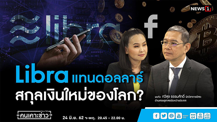 วันที่ 24 มิ.ย. นายทวีสุข ธรรมศักดิ์ นักวิชาการอิสระด้านเศรษฐศาสตร์ระหว่างประเทศ ได้สนทนาในรายการ "คนเคาะข่าว" ออกอากาศทางสถานีโทรทัศน์ผ่านดาวเทียมช่อง "นิวส์วัน" ในหัวข้อ "Libra แทนดอลลาร์ สกุลเงินใหม่ของโลก?"