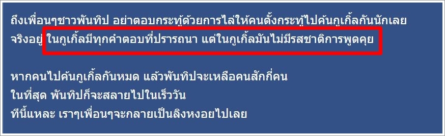 เราไม่ได้บอกว่าค้นกูเกิ้ลไม่ใช่วิธีที่ไม่ถูกต้อง การค้นกูเกิ้ลก่อนเป็นสิ่งที่ถูกต้องอยู่แล้ว แต่เราบอกว่าอย่าไล่คนไปหากูเกิ้ลโดยไม่จำเป็น นอกจากจะทำลายรสชาติการพูดคุยแล้ว ยังทำให้คนใหม่ๆกลัว-เบื่อหน่ายการเข้าพันทิป แล้วไม่กล้าตั้งกระทู้อีก