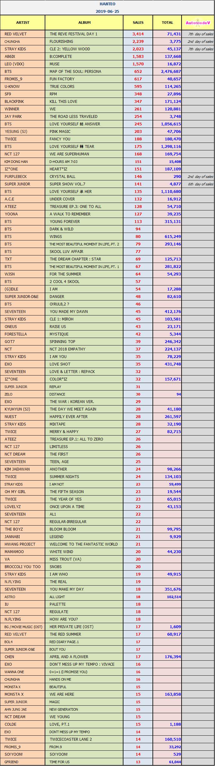 ยอดซื้ออัลบั้มจากชาร์ต HANTEO 19 มิถุนายน 2562 + GIRLGROUPS 1st Day + RED VELVET & STRAY KIDS