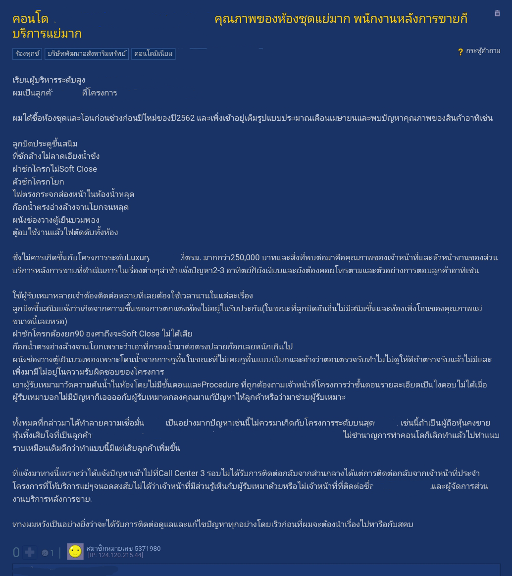จากกระทู้แนะนำล่าสุด ร้องเรียนคุณภาพของคอนโดมิเนียมแห่งหนึ่ง ที่ทางเว็บไซต์เพิ่งลบไป