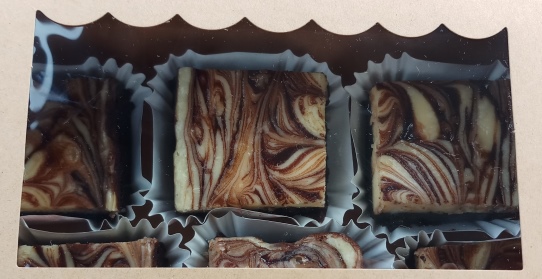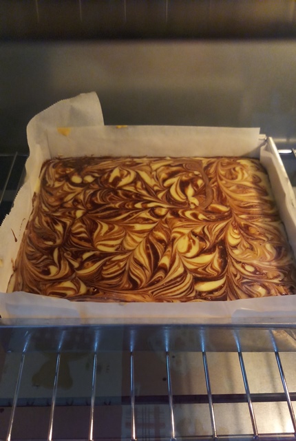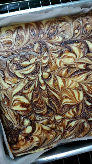 6.นำเข้าเตาอบ ใช้เวลาประมาณ 35-40 นาทีแล้วแต่เตานะค่ะ หรือสังเกตุ ดูตรงกลางครีมชีสถ้าแห้งๆ หน้าเด้งๆ แสดงว่าสุกค่ะ เนื้อบราวนี่ที่ได้