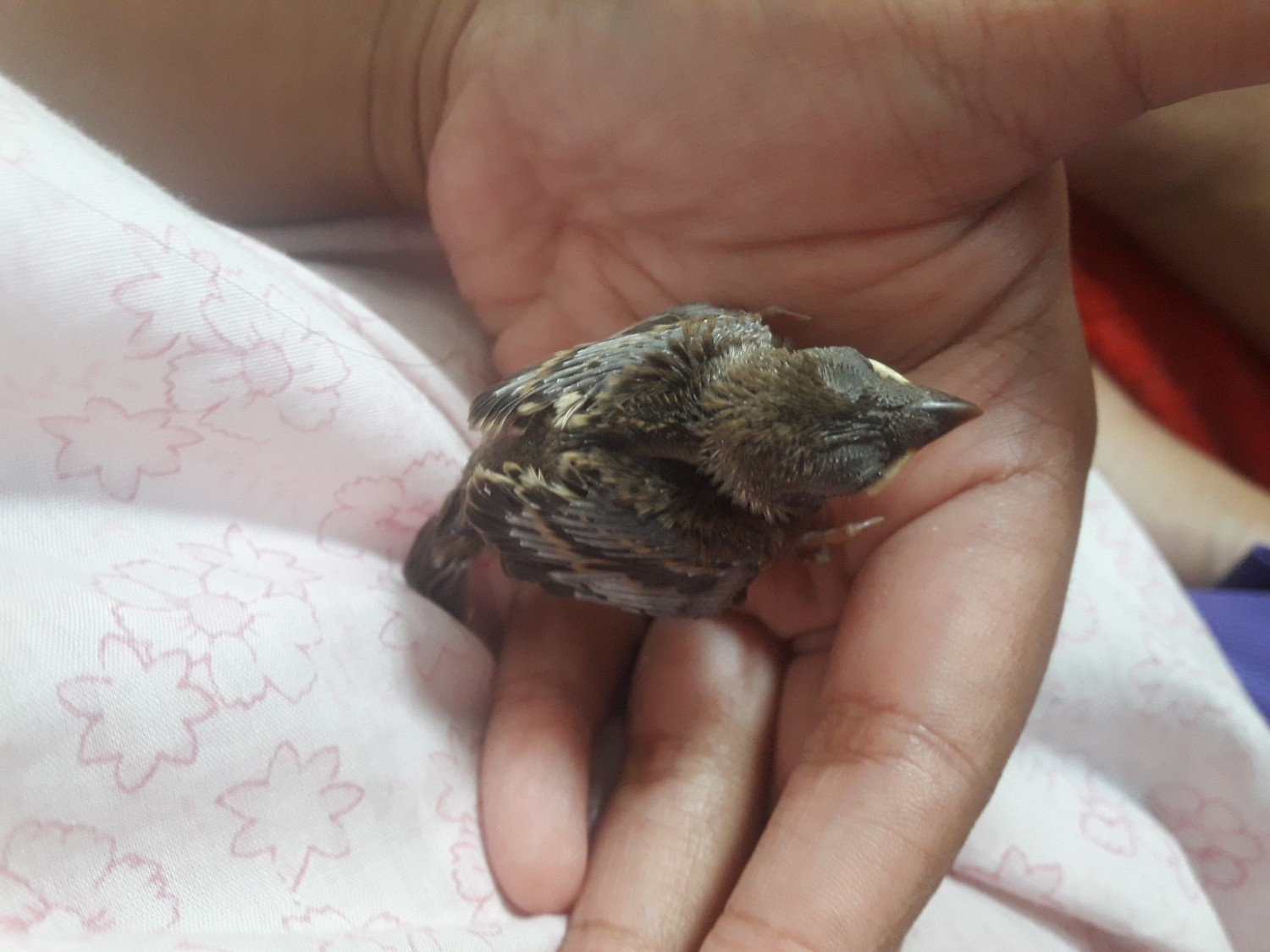 พอดีเราเจอลูกนกตกจากรัง แอบนั่งรอดูสักพักแม่นกก็ไม่มาซะที ก็เลยเก็บมาดูแลได้ 2 วันแล้วค่ะ หลังจากพาไปหาหมอ ซื้ออาหารนกจากร้าน ได้ข้อมูลว่าน่าจะเป็นนกขมิ้น เราก็ได้ให้อาหารเป็นอาหารสำหรับนกขุนทองแช่น้ำ