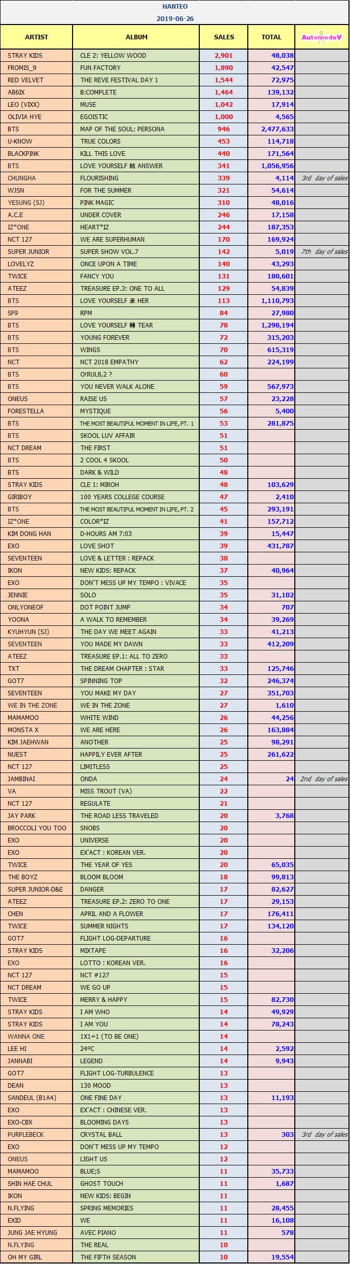 ยอดซื้ออัลบั้มจากชาร์ต HANTEO 27 มิถุนายน 2562