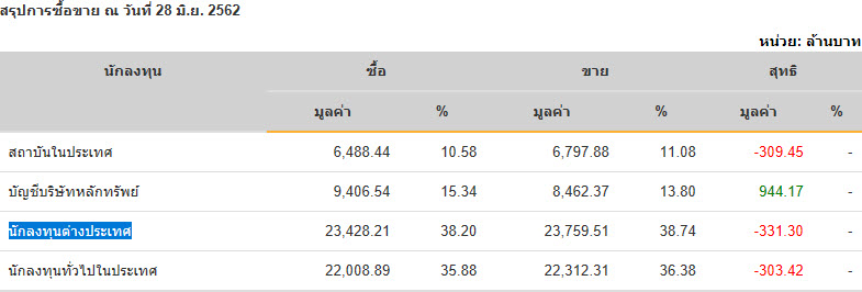 Sinthorn Summary 28/6/2562 : ต่างชาติขายสุทธิ -331.30 ลบ.