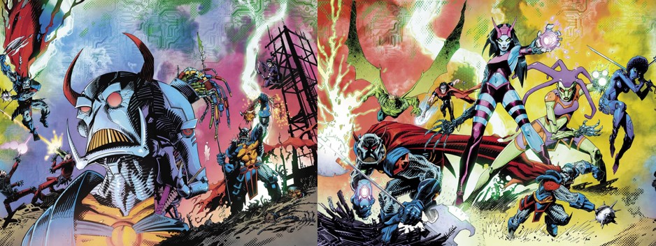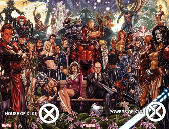 ภาพโปรโมทมินิซีรีส์ House of X กับ Powers of X ถูกหั่นครึ่งแล้วแบ่งเป็นปก variant ตอนที่ 1 ของทั้งสองเรื่อง