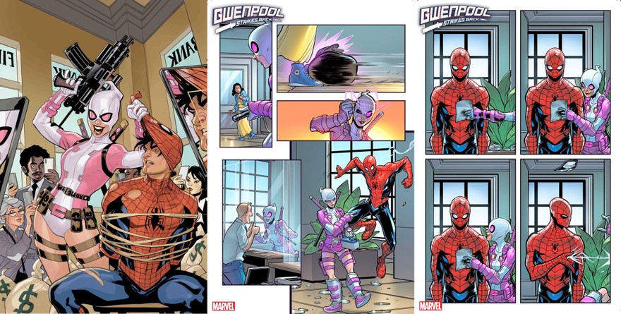 Gwenpool Strikes Back #1 เกวนพูลทำอะไรบางอย่าง (ดูไม่ออกแฮะ ช่วยจับโจรปล้นธนาคารเรอะ) พอสไปดี้มาถึงเธอก็โชว์รูปบางอย่างให้ดู เลยโดนเล่นซะ