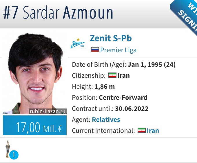 2. Shadar Azmoun (Iran, 17 ล้านยูโร)