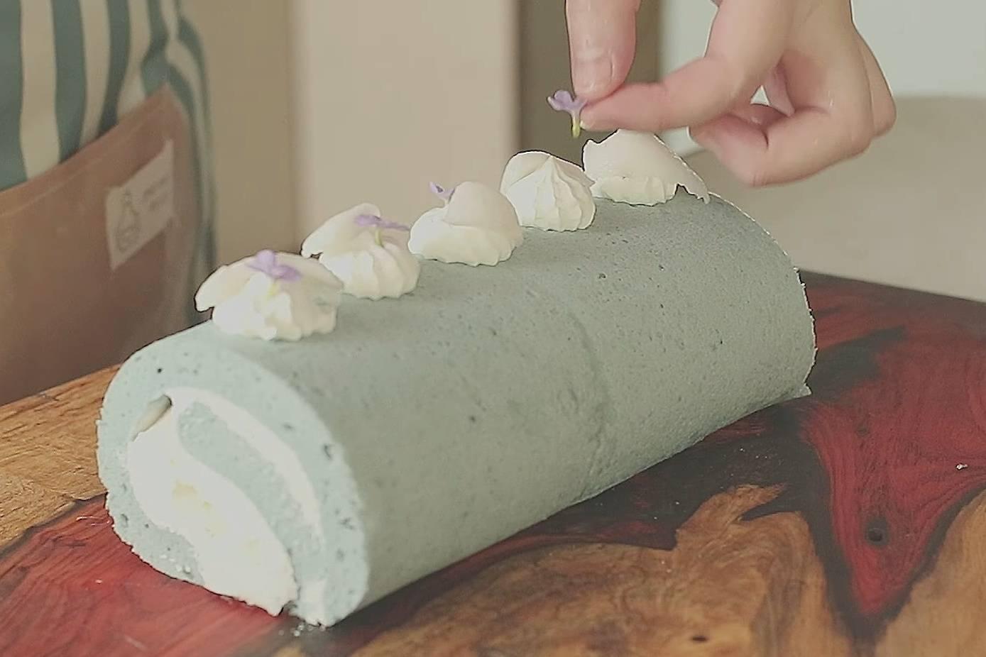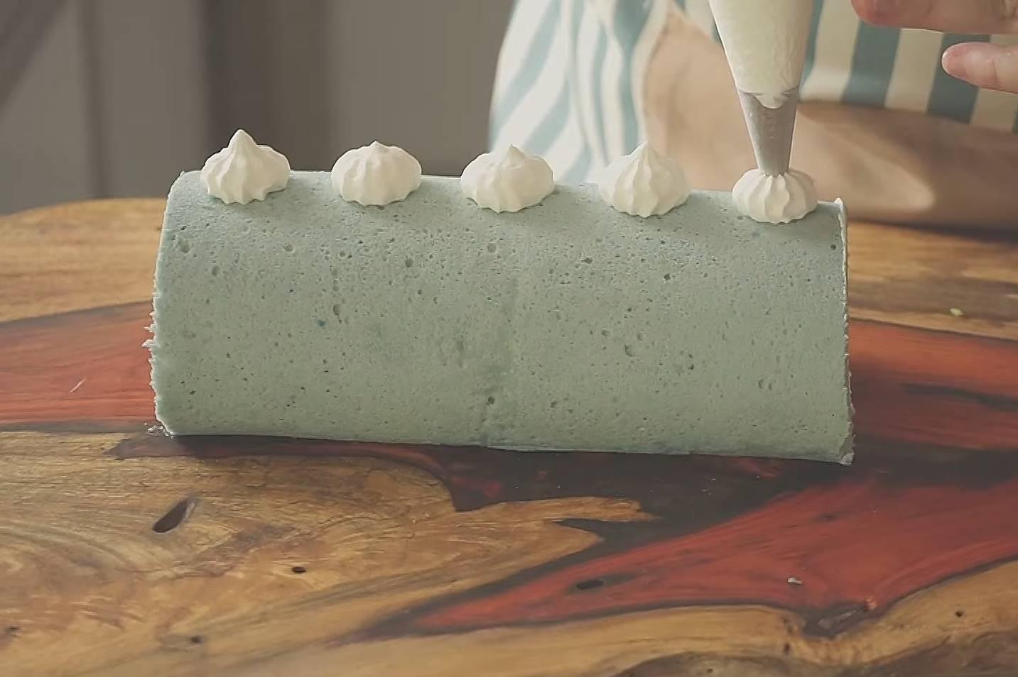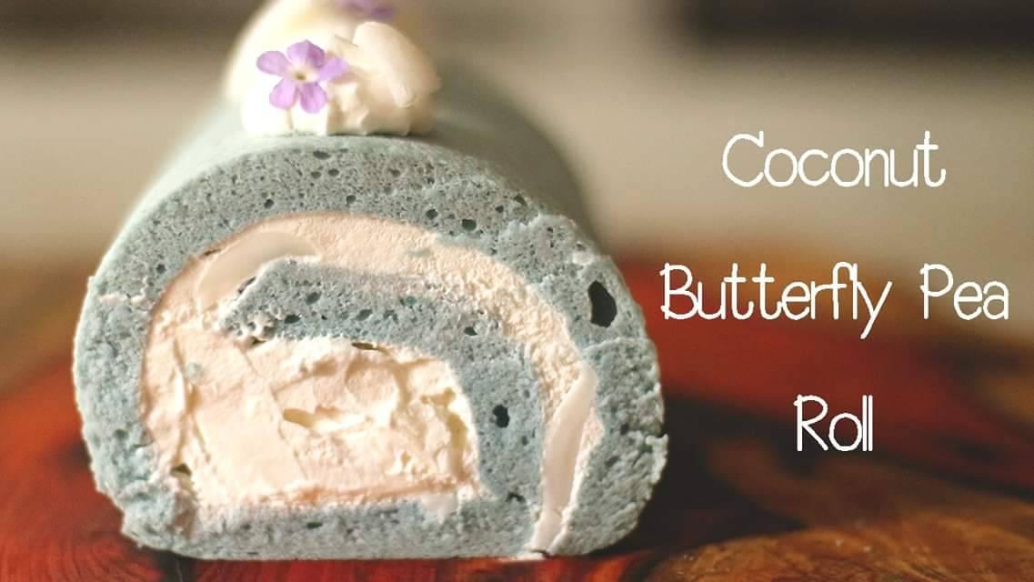 โรลมะพร้าวอัญชันหอมๆ สีฟ้าพาสเทลจากอัญชัน พร้อมไส้วิปปิ้งมะพร้าวนุ่มๆ ตกแต่งด้วยวิปปิ้งครีม มะพร้าวอ่อนและดอกไม้แบบทานได้