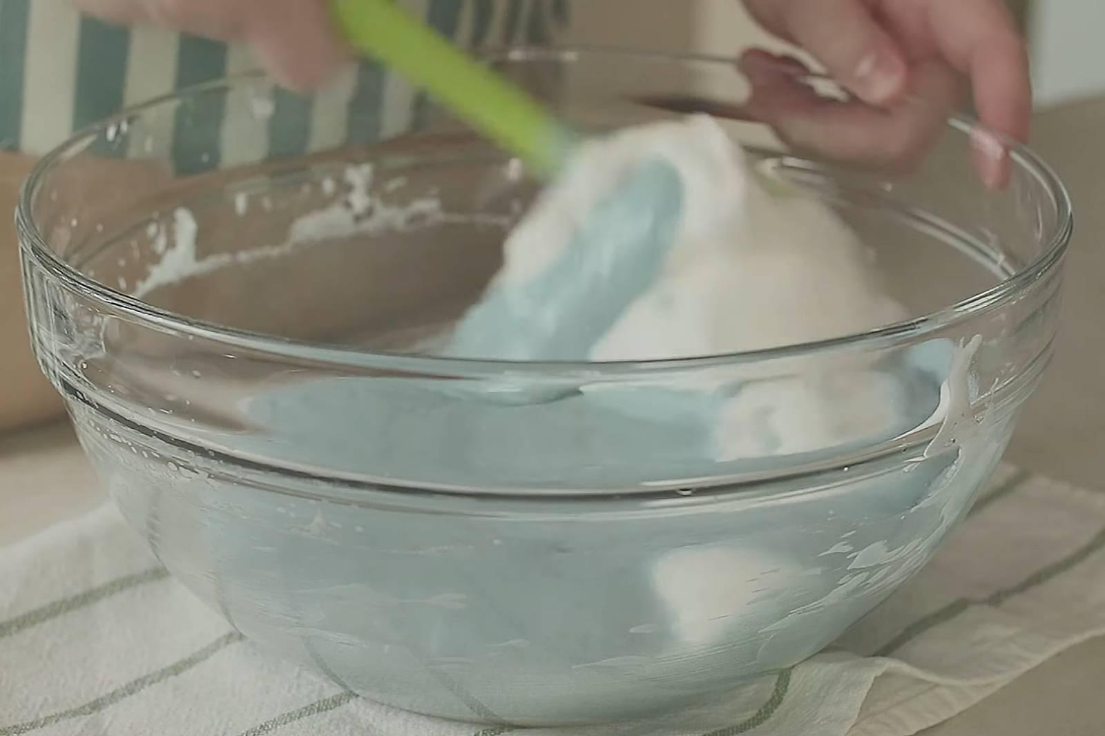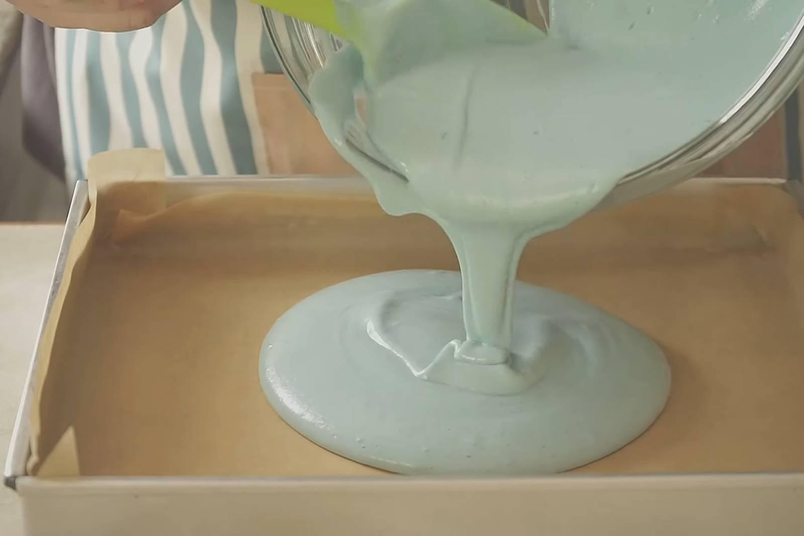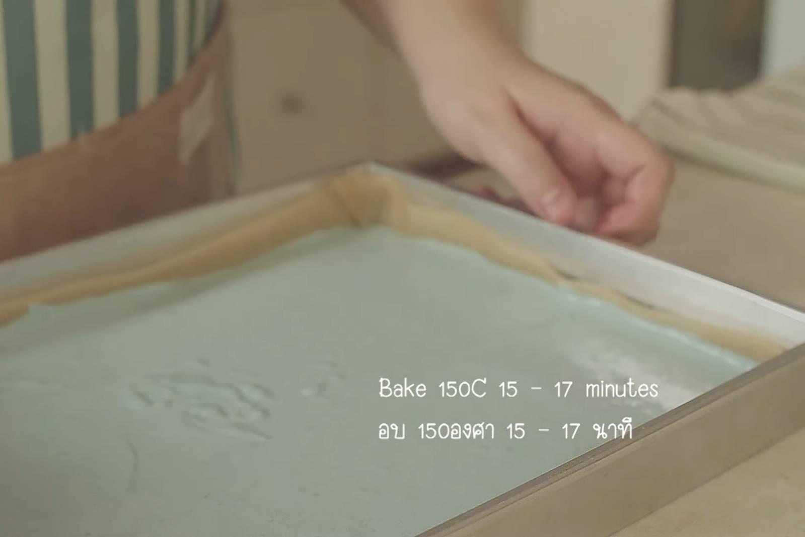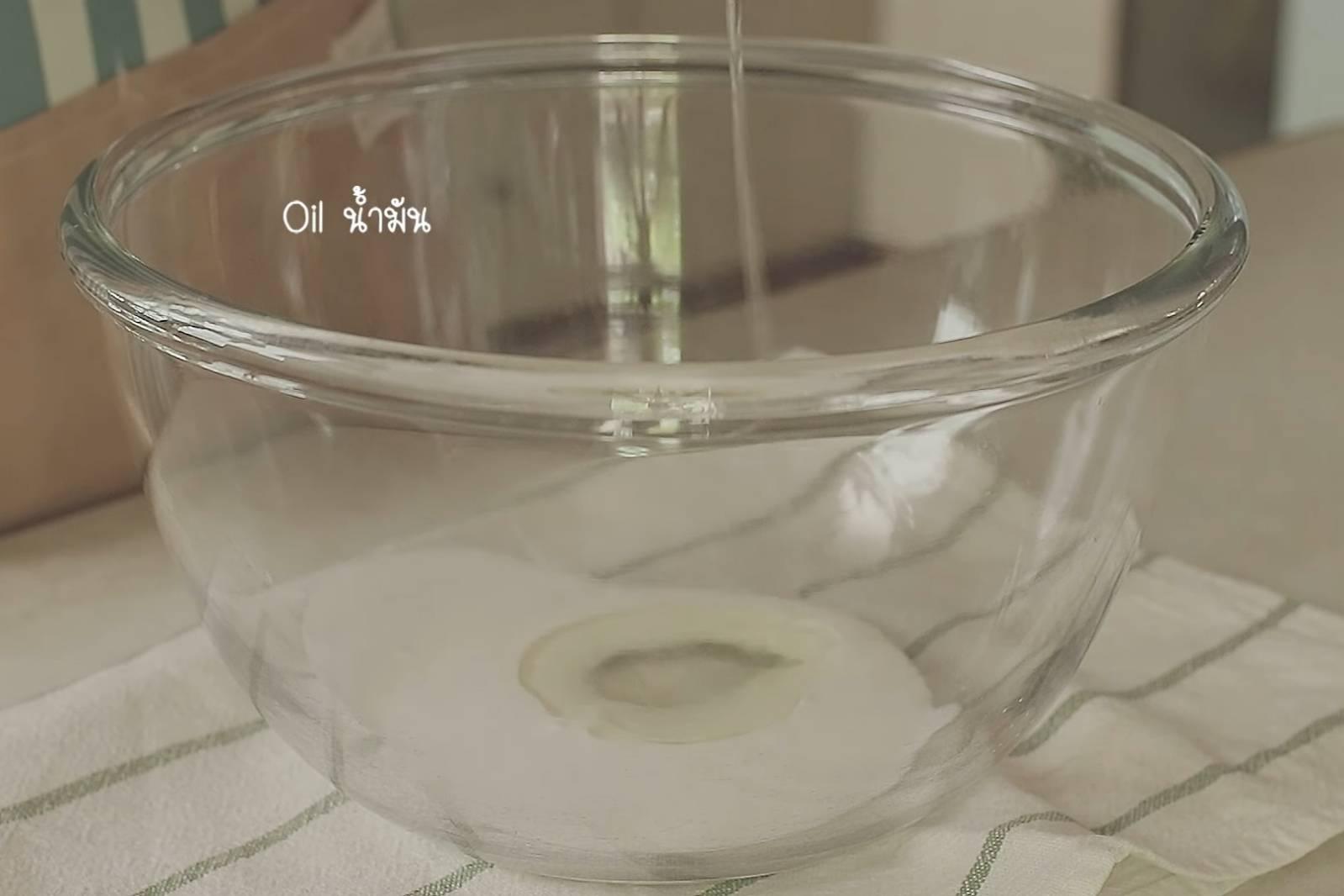 5. ตะล่อมไข่ขาวเข้าไปในแบทเทอร์อย่าให้หยุบ นำใส่ถาดขนาด 15 x 9 นิ้ว ที่วางกระดาษรองอบแล้ว นำอบ 15 – 17 นาที