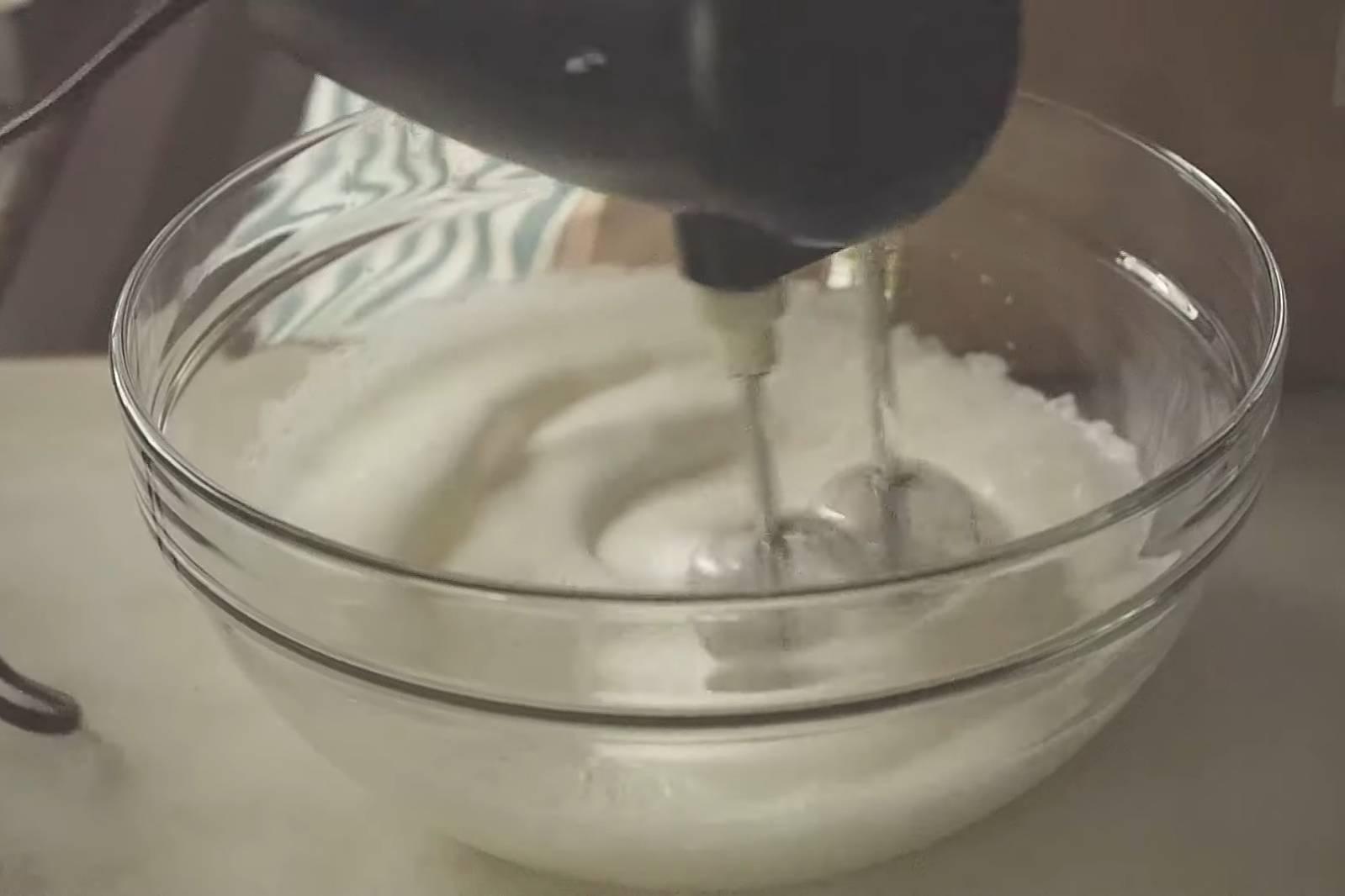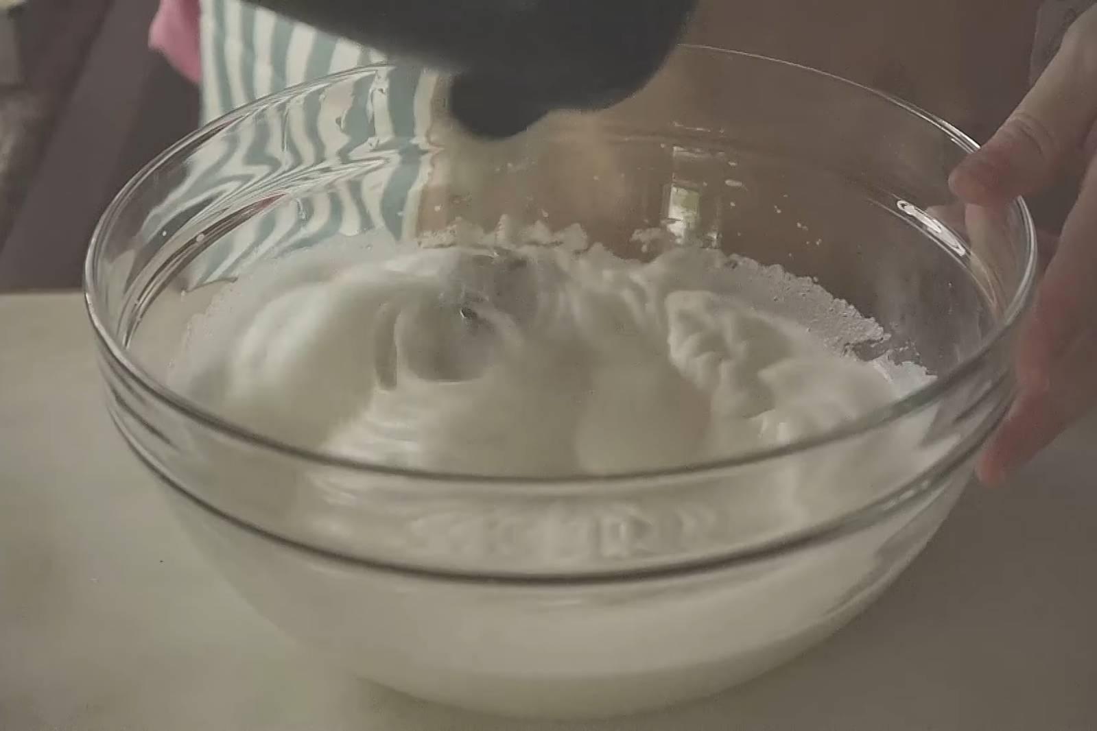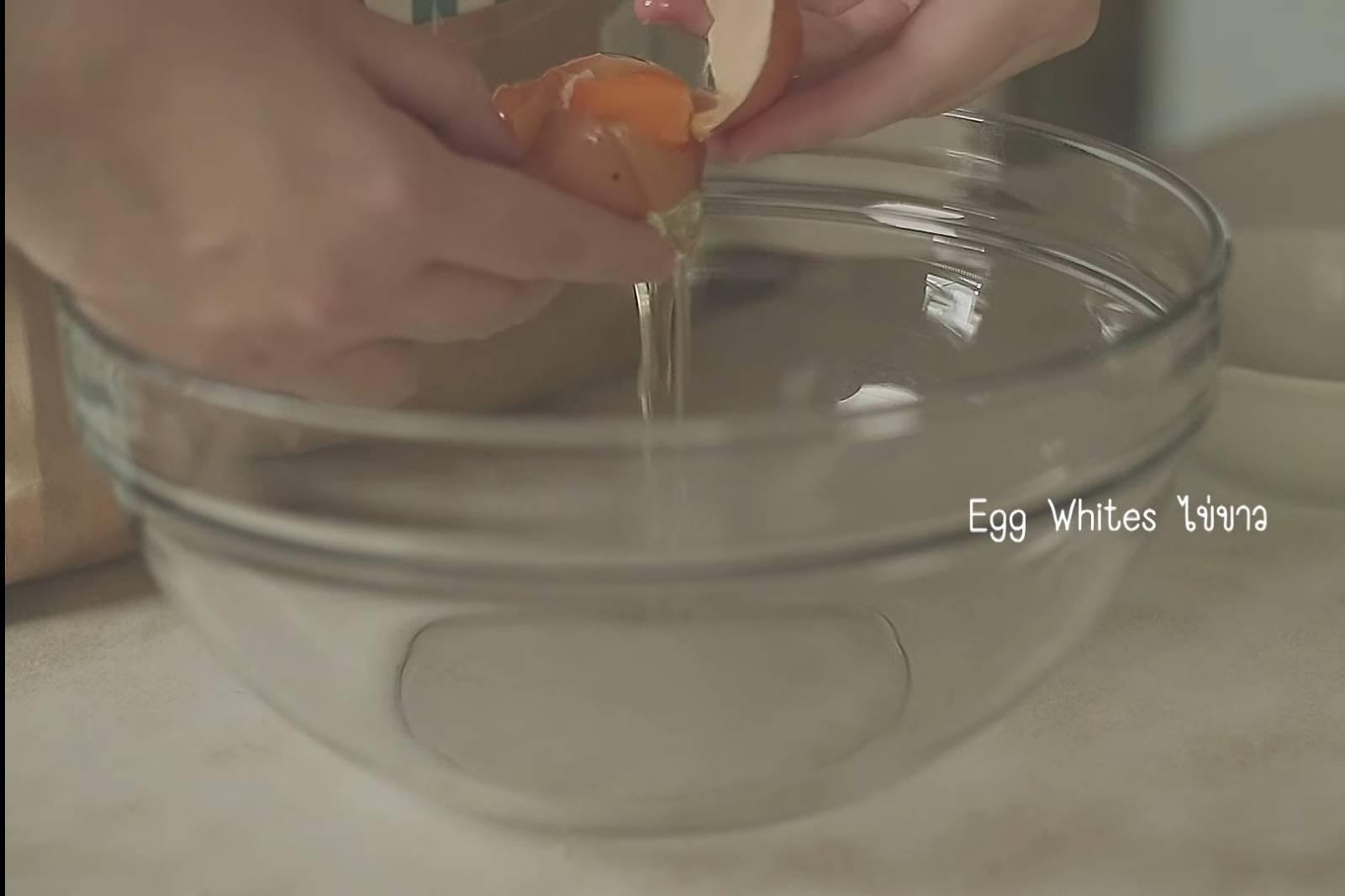 4. ตีไข่ขาวกับน้ำตาล (แบ่งน้ำตาลเป็น 2 รอบ) ให้ได้ยอดอ่อน