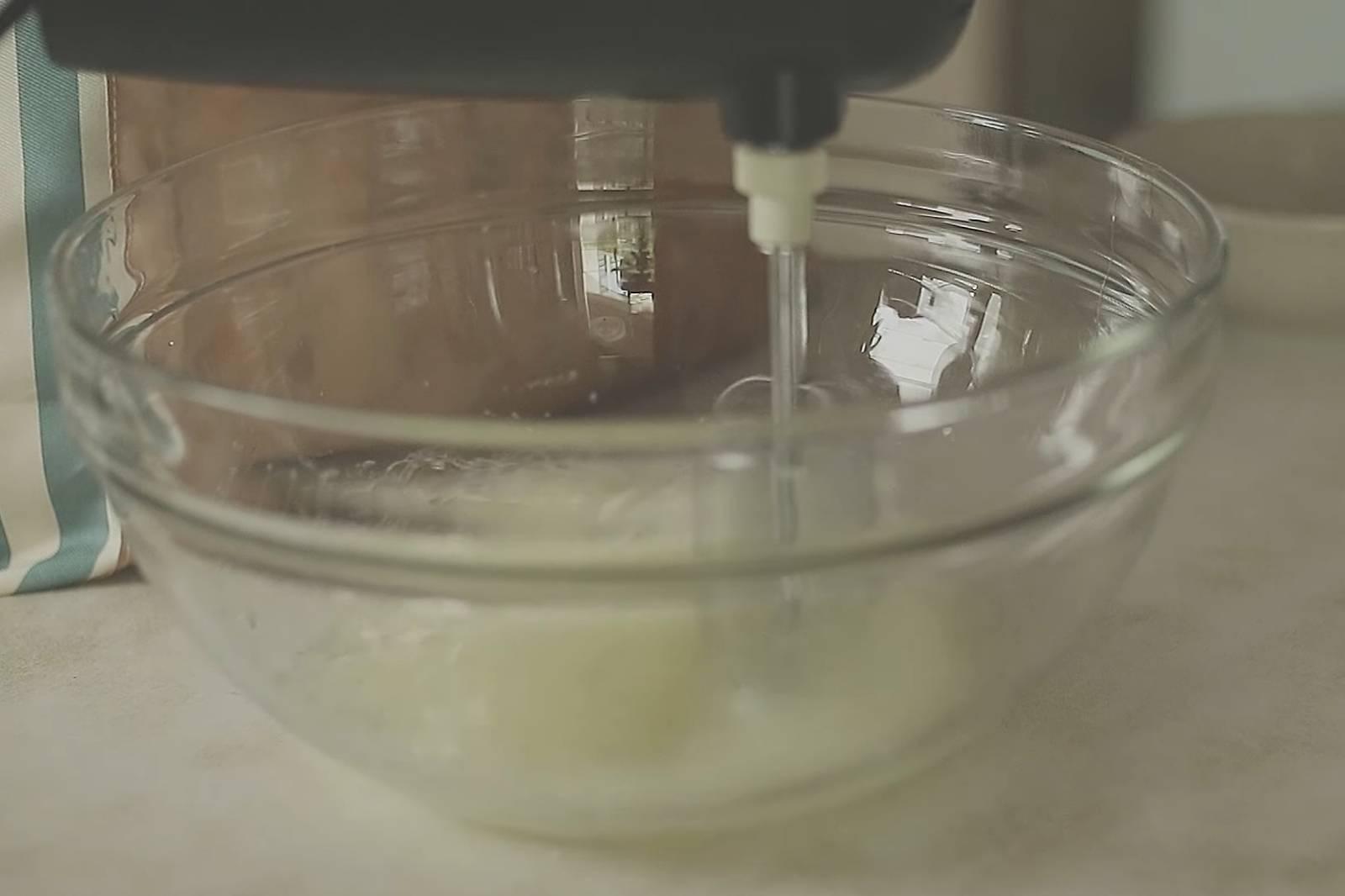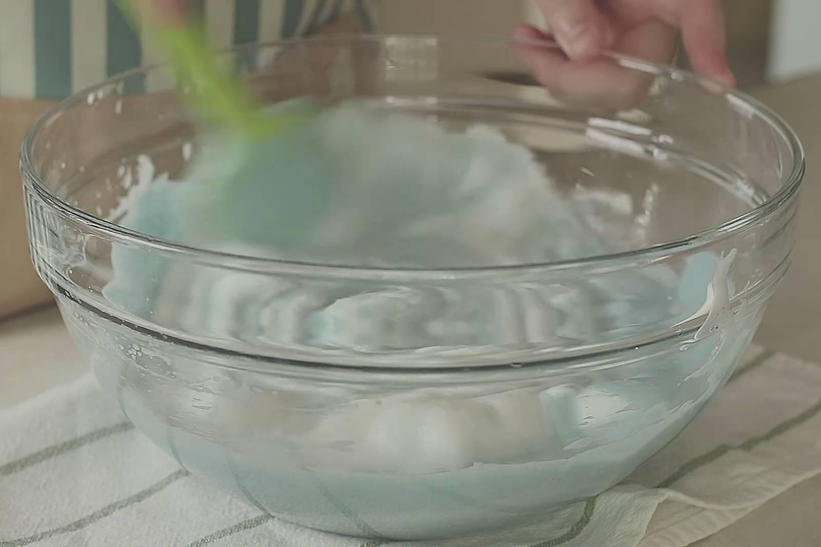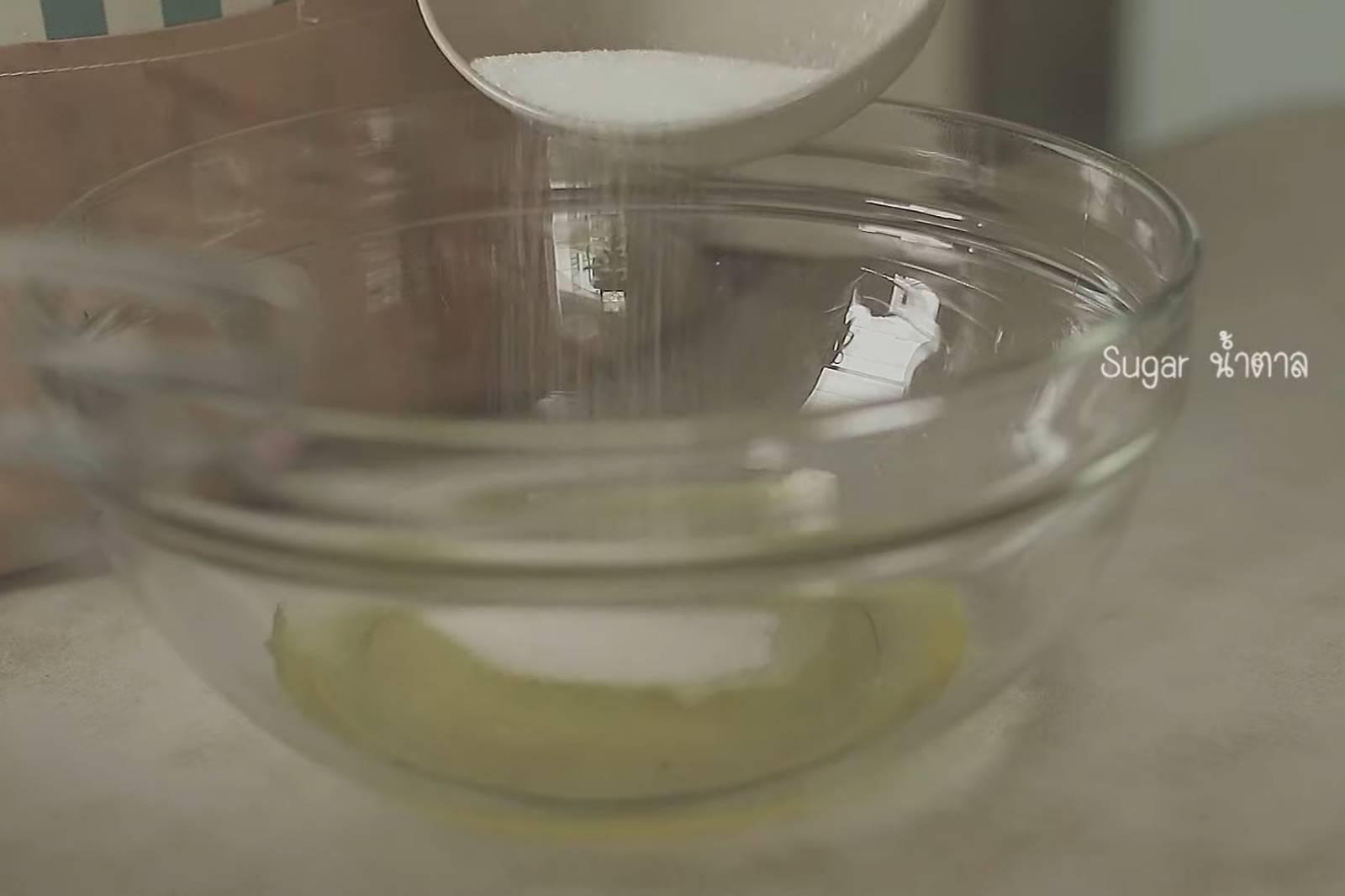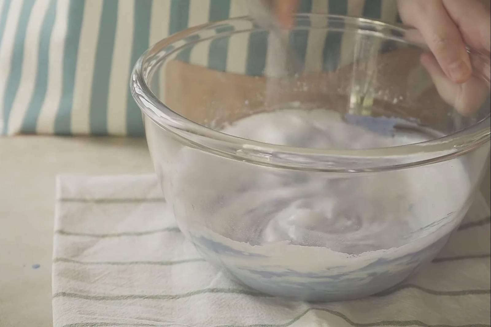 4. ตีไข่ขาวกับน้ำตาล (แบ่งน้ำตาลเป็น 2 รอบ) ให้ได้ยอดอ่อน