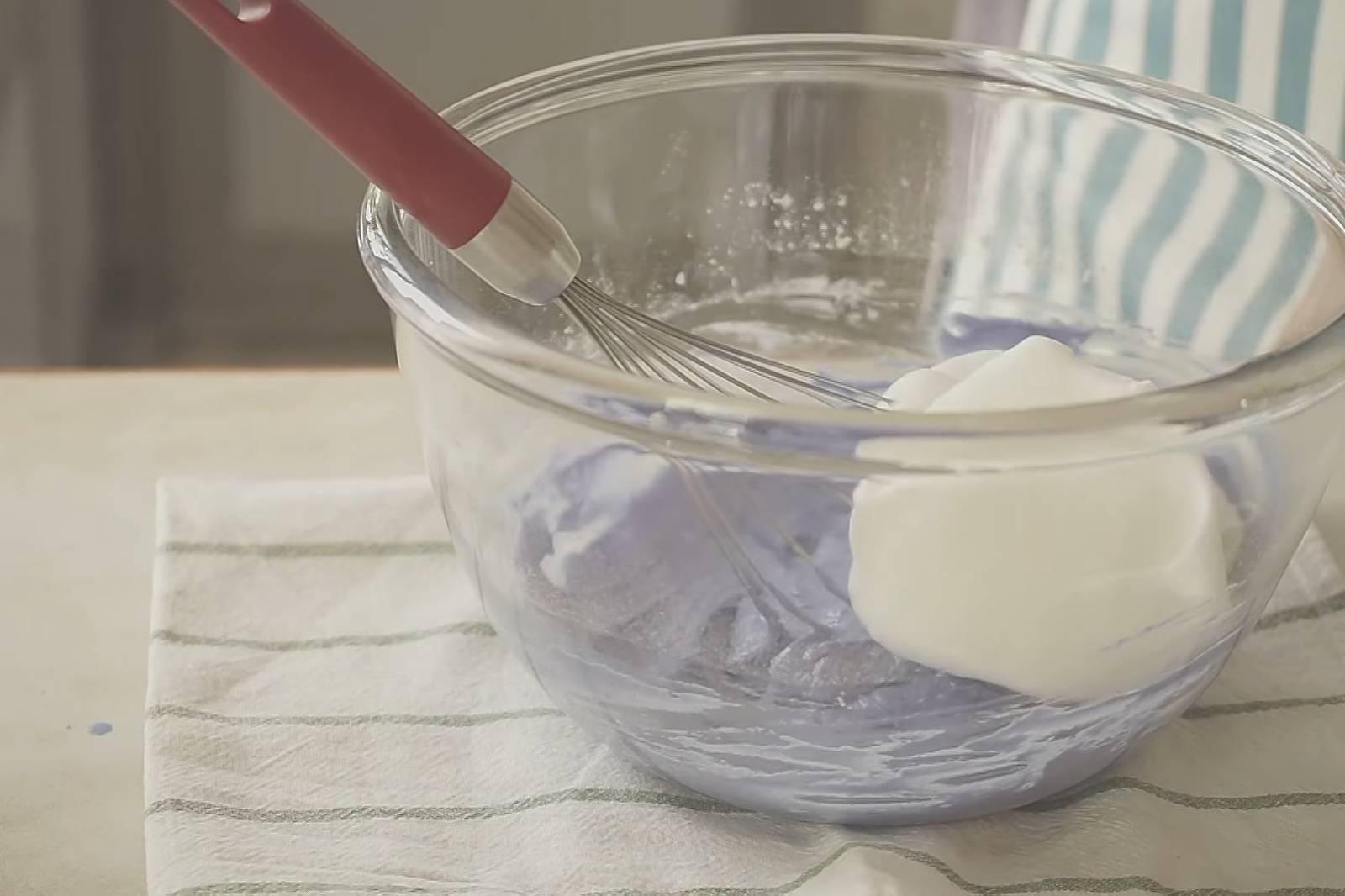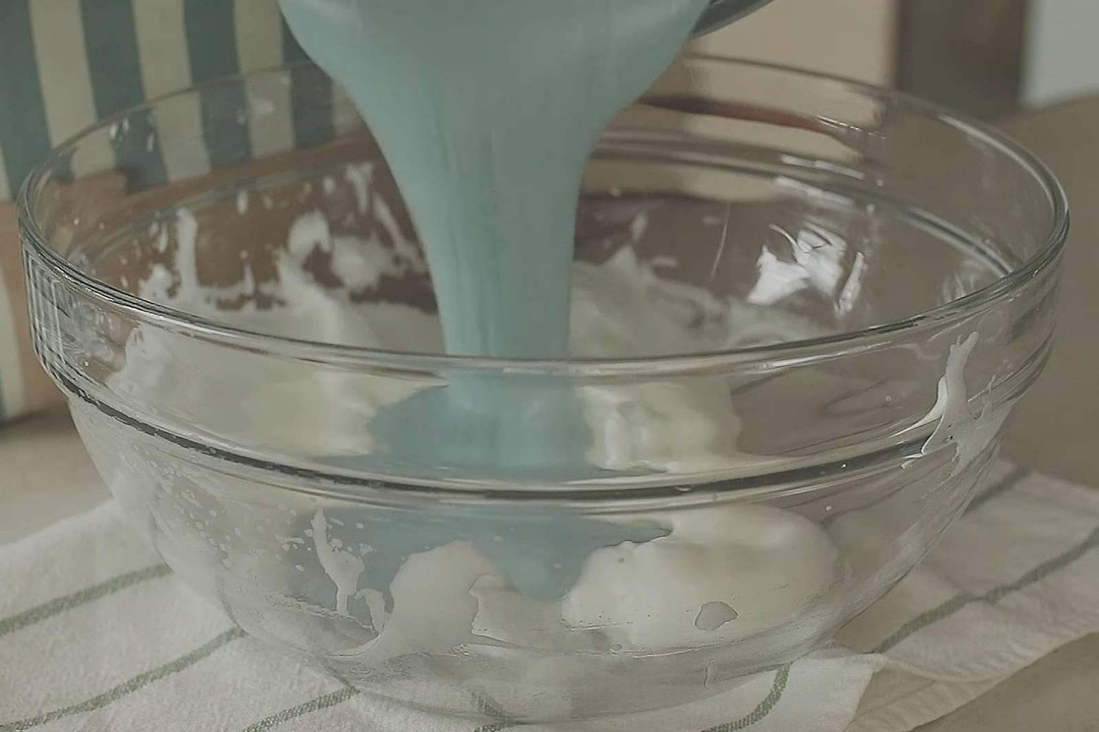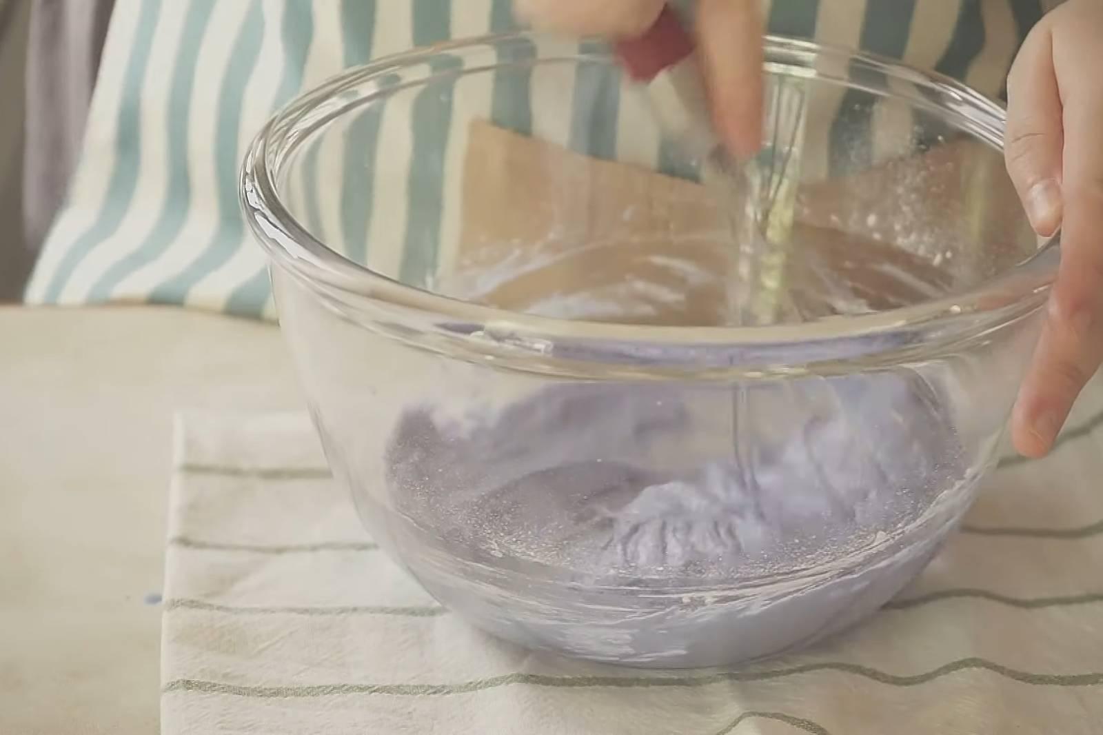 3. ผสมน้ำอัญชัน กะทิ น้ำมัน แป้งเค้ก เกลือ จะได้แบทเบอร์ข้นๆ