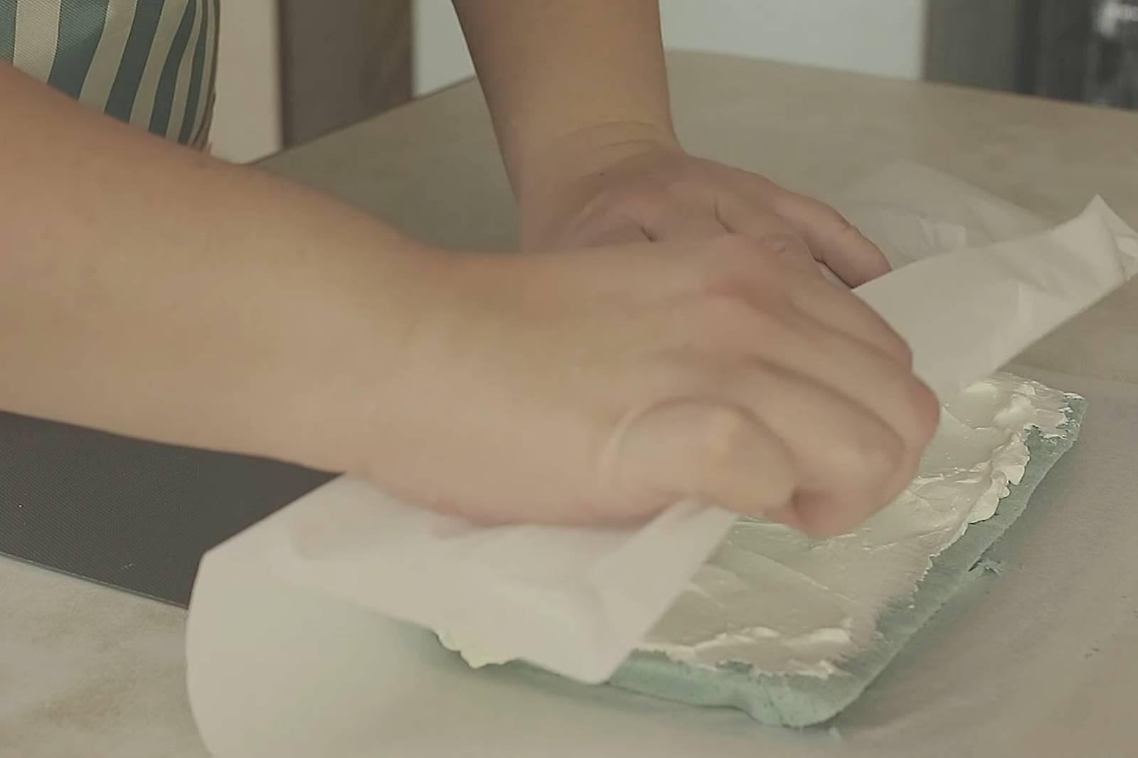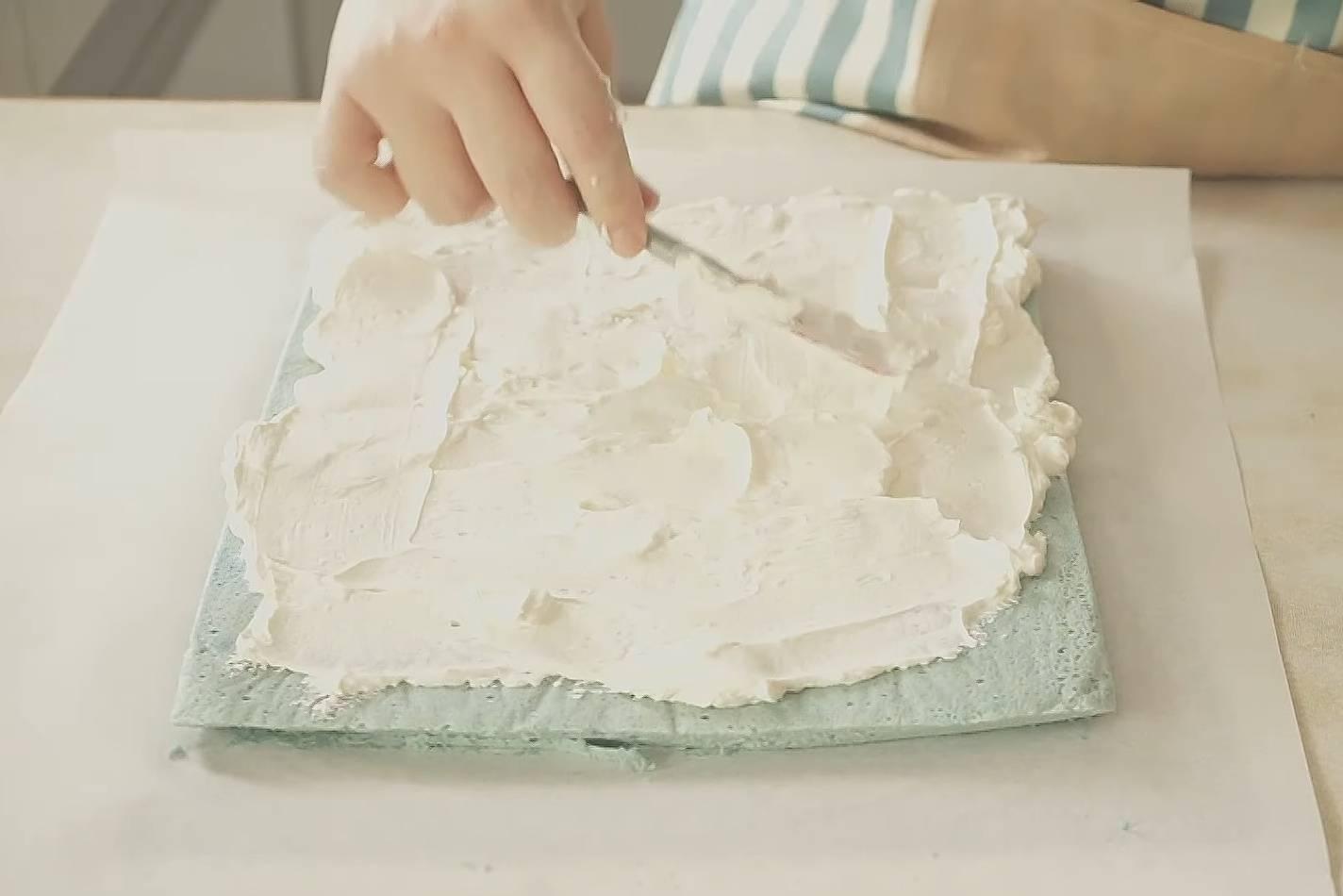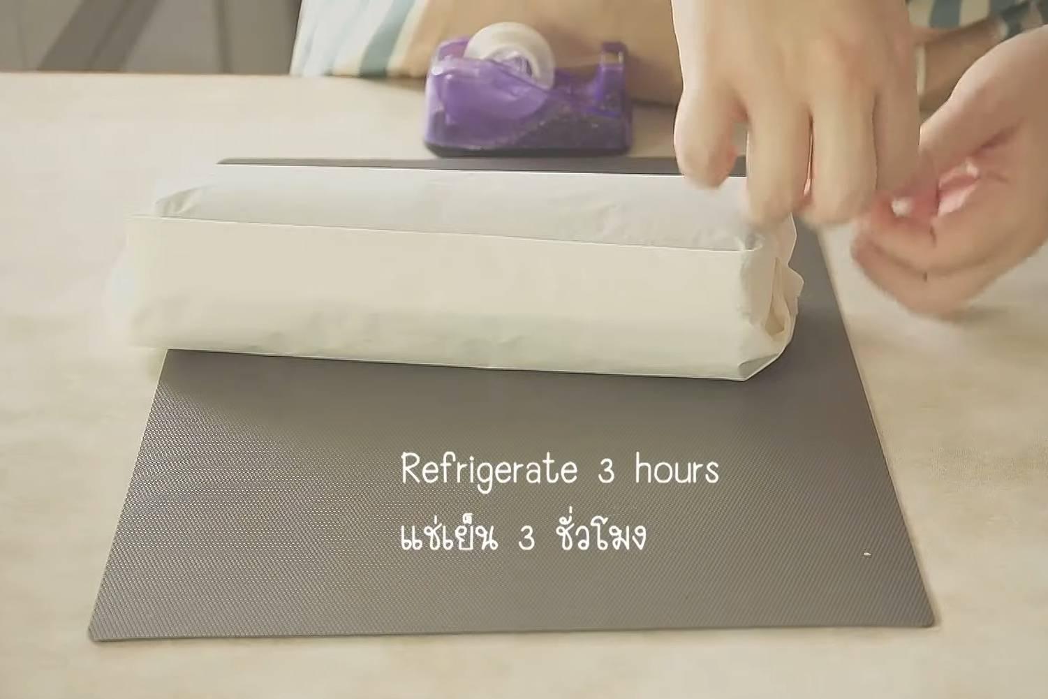 8. ปาดครีมให้ทั่วชิฟฟอน ม้วนให้เป็นขอน แปะสก็อตเทปท้ายทั้ง 2 ด้านและตรงกลาง พักในตู้เย็น 3 ชั่วโมง