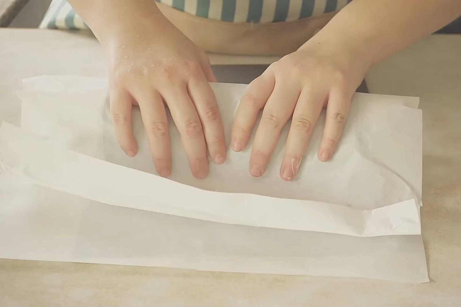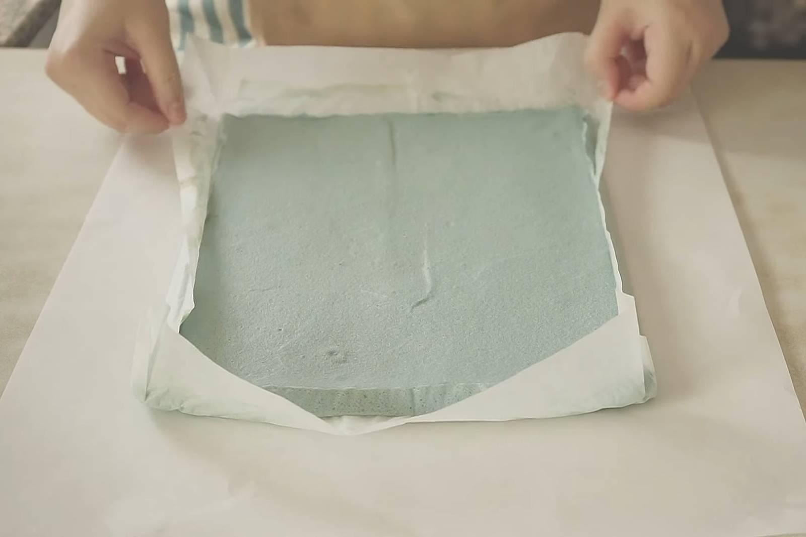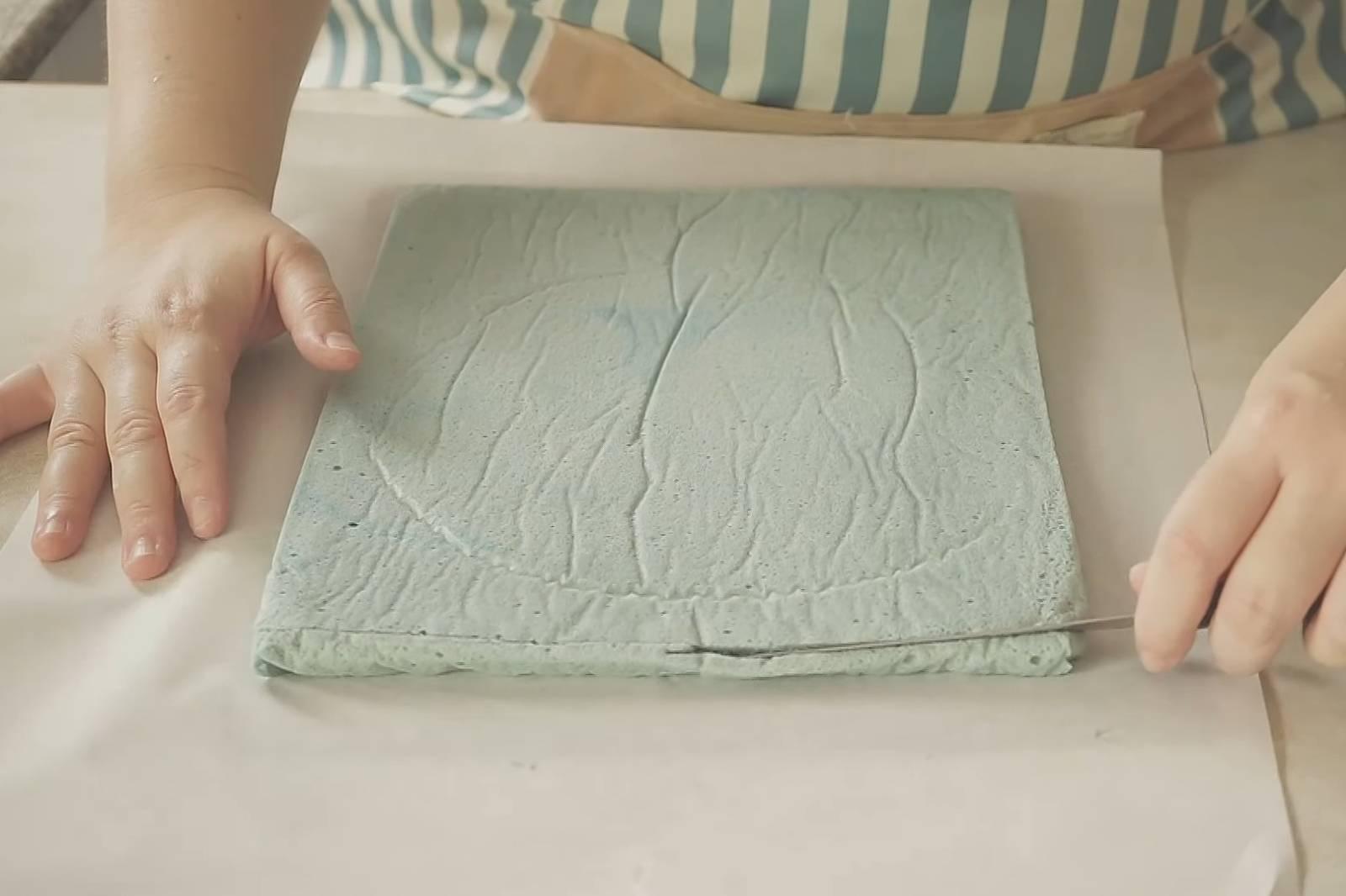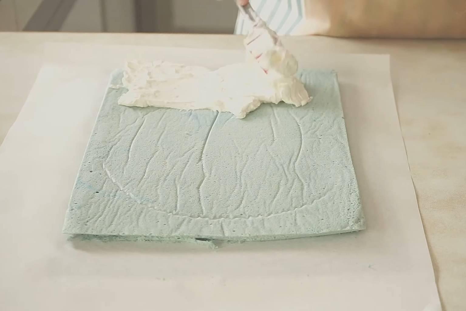 8. ปาดครีมให้ทั่วชิฟฟอน ม้วนให้เป็นขอน แปะสก็อตเทปท้ายทั้ง 2 ด้านและตรงกลาง พักในตู้เย็น 3 ชั่วโมง