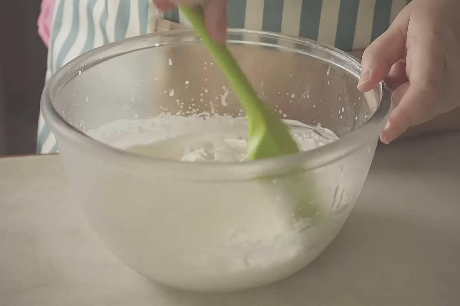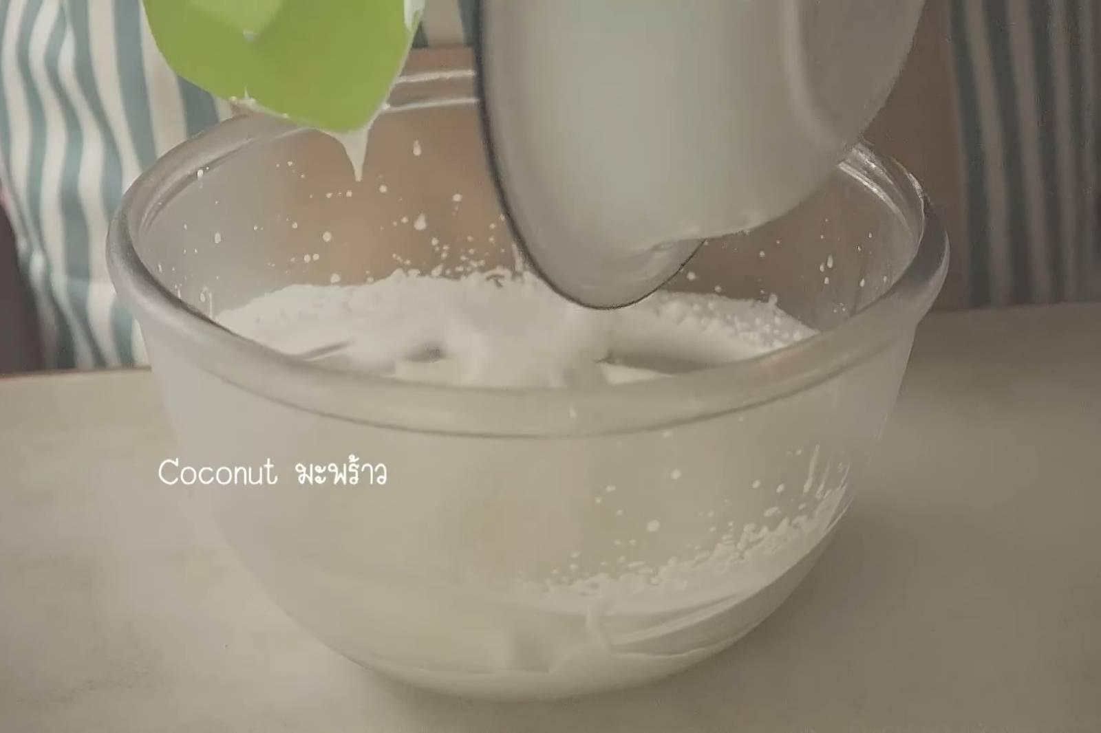 7. ระหว่างรอชิฟฟอน ตีวิปปิ้งครีม (เพิ่มน้ำตาลไอซิ่ง ถ้าต้องการ) ให้เป็นยอดอ่อน แล้วตะล่อมมะพร้าวสไลด์