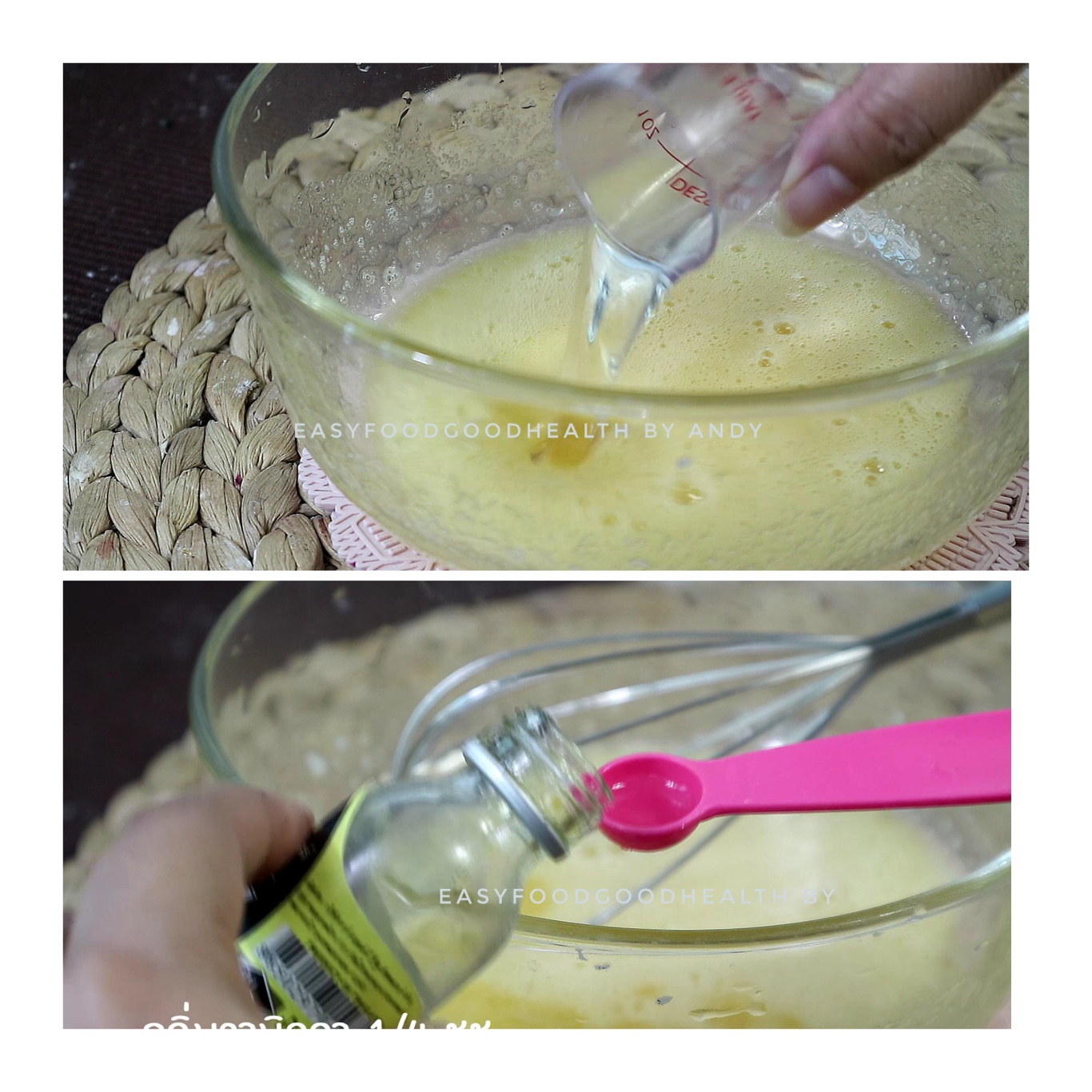 2.นำไข่ไก่ใส่ในชามผสมคนจนเนื้อเนียน ใส่น้ำตาลทรายคนจนน้ำตาลทรายละลาย จากนั้นใส่กลิ่นวานิลลาและน้ำมันพืชคนให้เข้ากัน