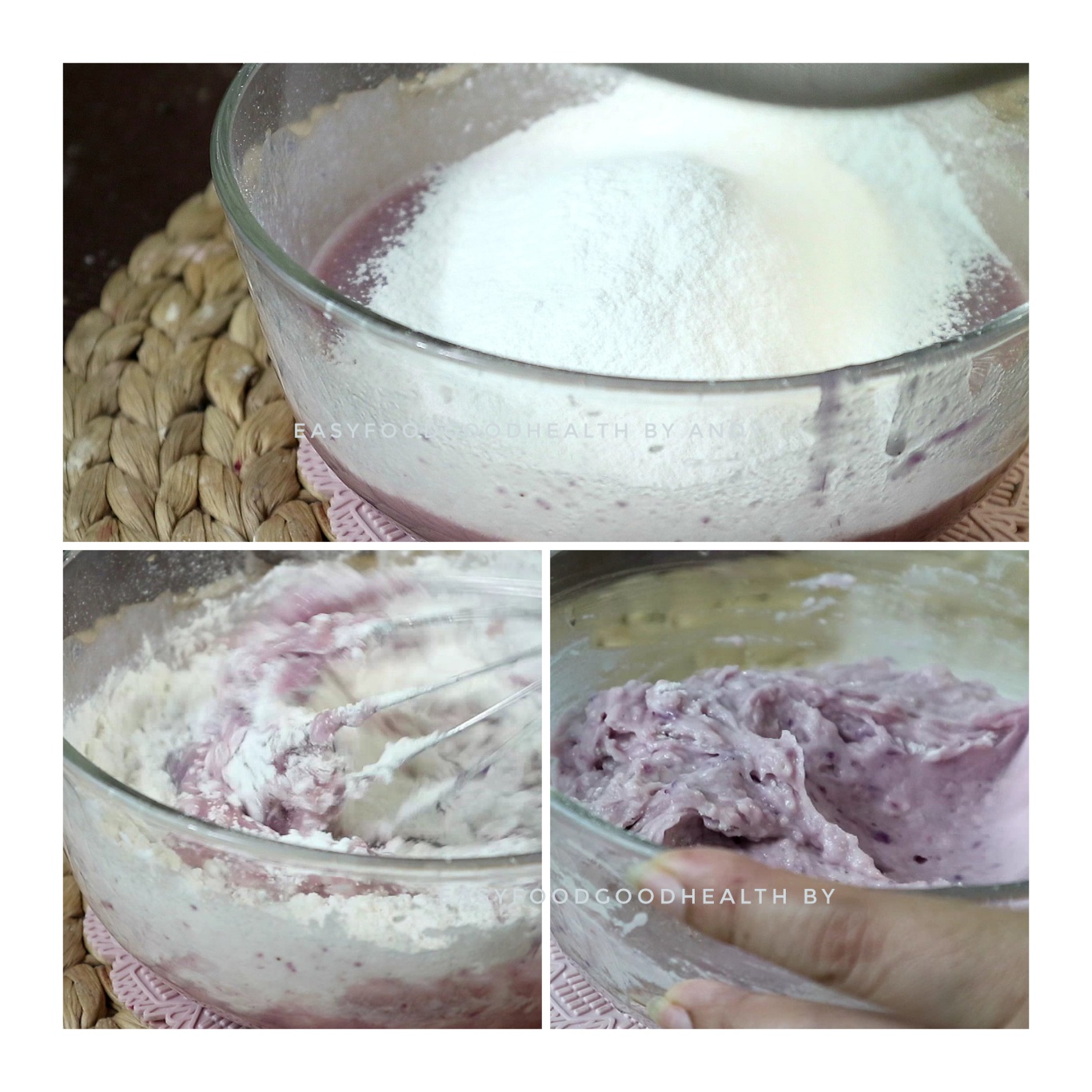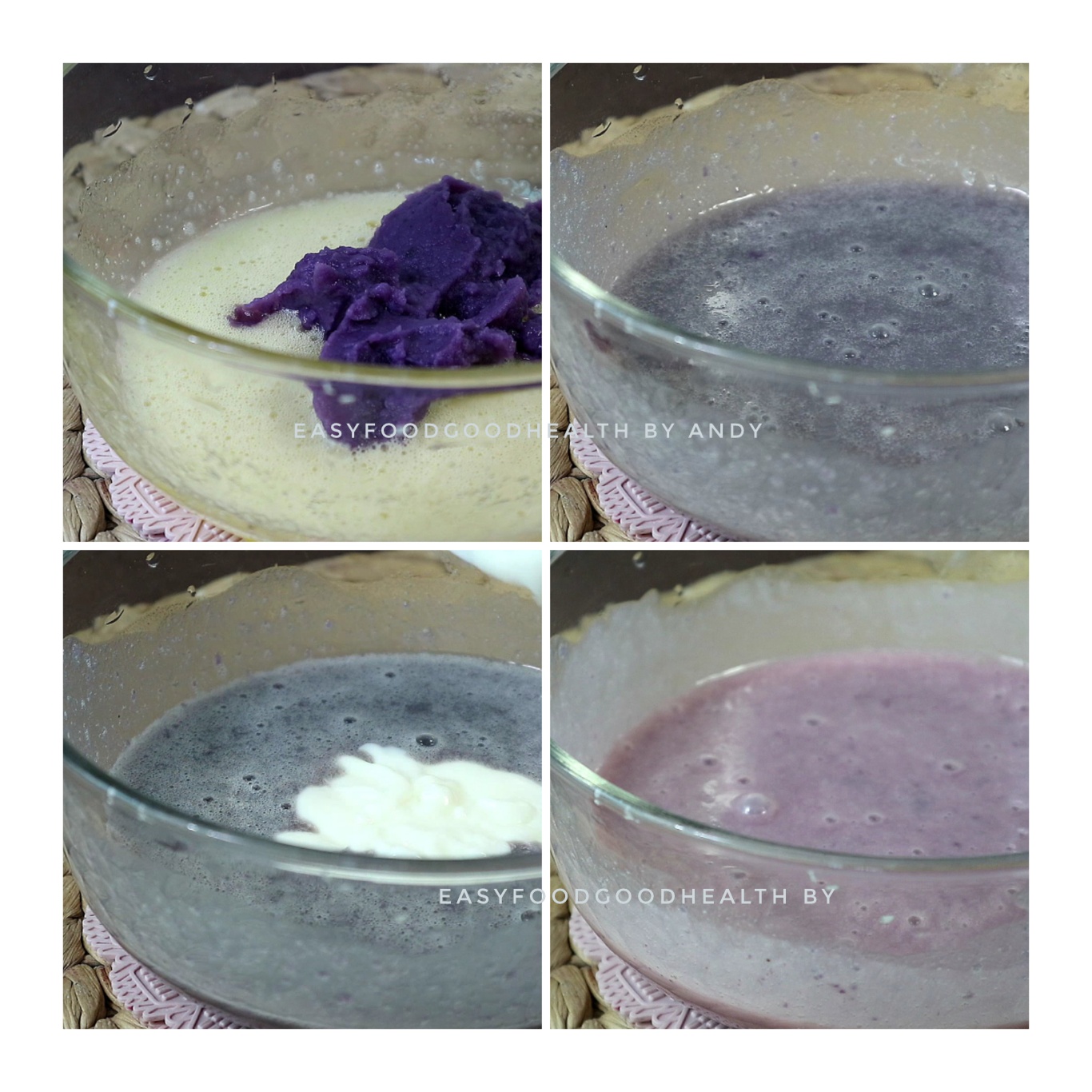 3.นำมันม่วงที่ปั่นละเอียดลงไปคนให้เข้ากันตามด้วยโยเกิร์ตคนให้เข้ากัน