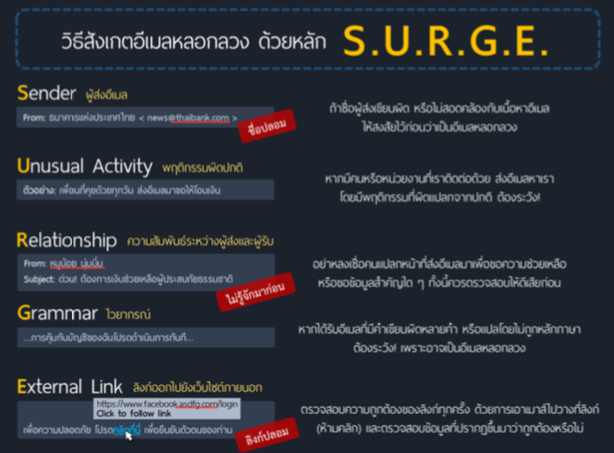 หากได้รับอีเมลต้องสงสัยให้ “คิด” ก่อน “คลิก” ควรตรวจสอบ ผู้ส่ง เน้ือหา และลิงก์ภายในอีเมลโดยละเอียดก่อนตอบกลับหรือให้ ข้อมูลใดๆ ทุกคร้ัง