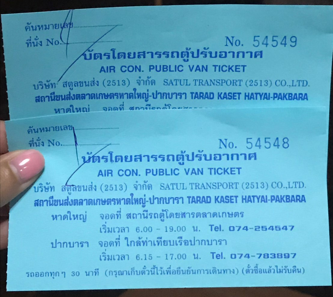 พอกินเสร็จเราก็เปิด Google Map กลับไปที่ตลาดกิมหยงที่เดิมเพื่อต่อสองแถวไปคิวรถตู้ตลาดกเกษตร จริงๆมีสองแถวหรือตุ๊กๆอยู่หน้าร้านเลยนะคะแต่เป็นแบบเหมาไปเราถามราคาบอก 150 บาท เรารู้สึกว่าแพงเลยไม่ไปจ้า เราเลยตัดสินใจเดินจ้าาาา มันไม่ไกลนะประมาณ 1 กิโลนิดๆ เดินแค่ 15-20 นาทีก็ถึง ระหว่างทางเดินก็จะมีเซเว่นมีร้านขายของตามทาง พอถึงหน้าตลาดกิมหยงก็ขึ้นรถสองแถวที่หน้ารถมันจะเขียนว่า คิวรถตู้ตลาดเกษตร พอเรานั่งสองแถวมาเรื่อยๆ คิวรถตู้จะอยู่ฝั่งตรงข้ามให้เรามองดีๆ มันจะถึงก่อน โลตัสใหญ่ (ค่าสองแถวคนละ 10 บาท) แล้วก็ข้ามถนนมาซื้อตั๋วที่ช่องหมายเลข 9 จะเขียนว่า หาดใหญ่-ปากบารา (ค่าโดยสารคนละ 130 บาท)