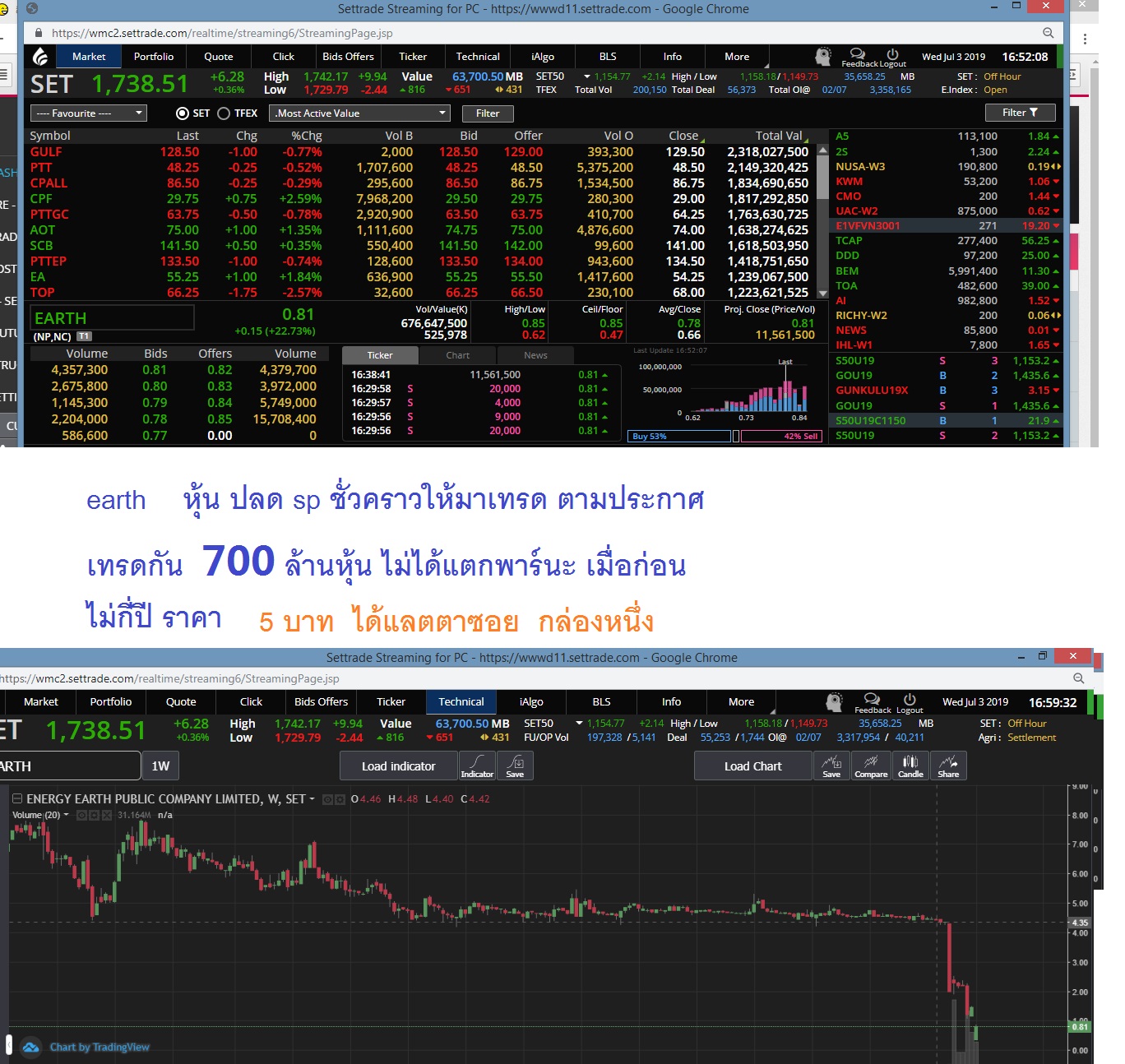 หุ้น earth นิ เทรดกันจะ 700 ล้านหุ้นละ .ราคา 0.81 บาท หุ้นไม่ได้แตกพาร์นะ มากจากราคาเดิม 9 บาท..คนจะจำหุ้นนี้อีกนาน