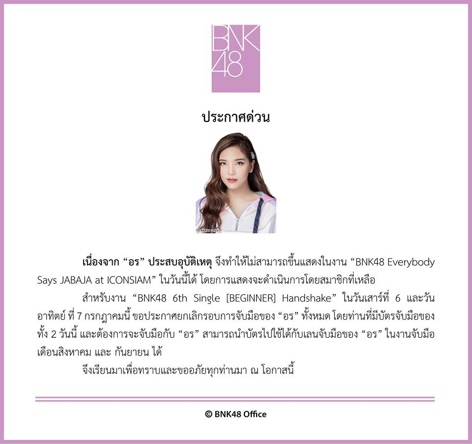 รวมถึง อร จะไม่สามารถเข้าร่วมงาน BNK48 6th Single Beginner Handshake ในวันที่ 6-7 กรกฎาคมนี้ได้ เช่นกัน