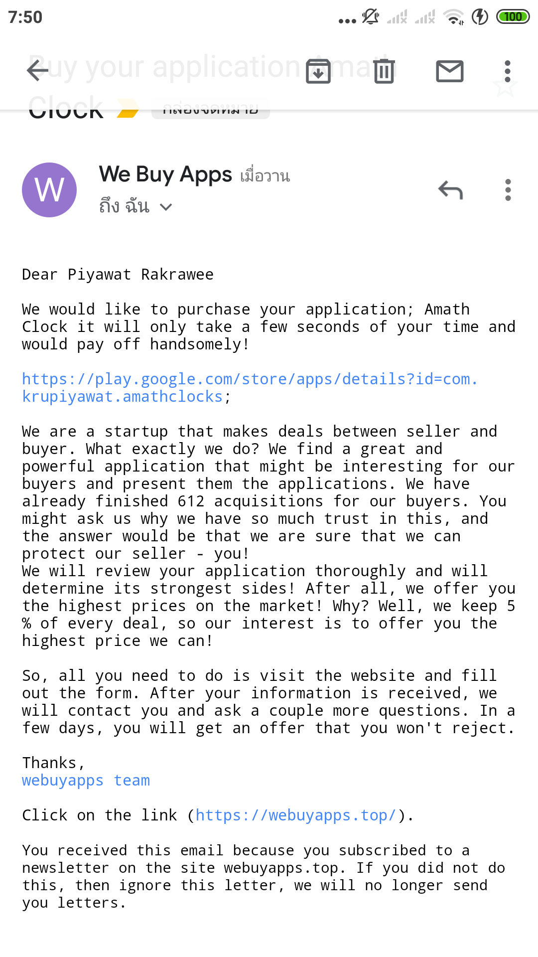 ได้รับเมล์จาก we buy apps เพื่อติดต่อซื้อแอพของเรา ไม่ทราบว่า อันนี้หลอกลวงรึป่าวครับ