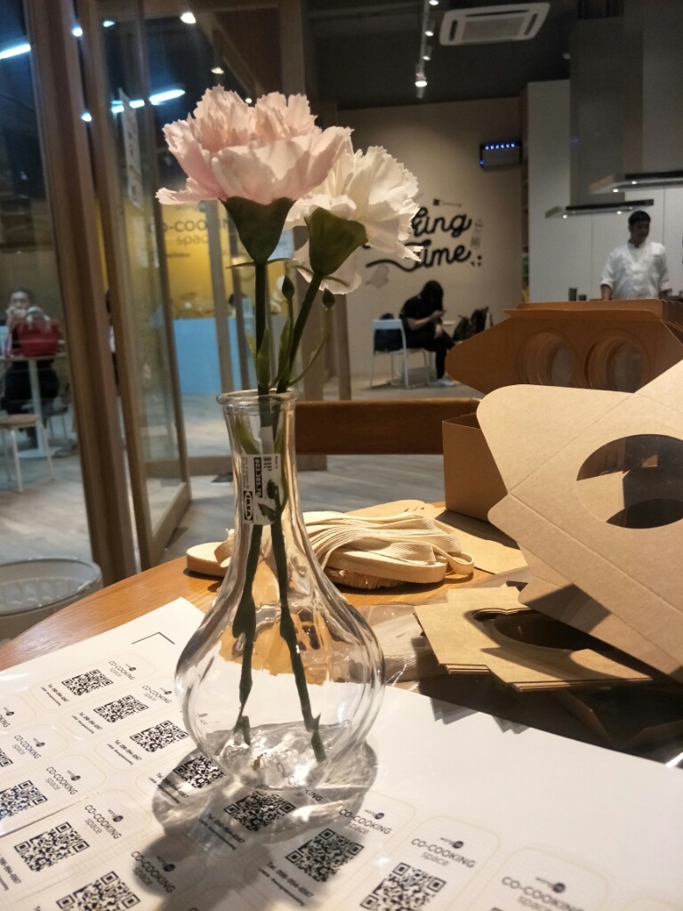 ระหว่างรอก็มานั่งเม้าท์มอยกับเพื่อนร่วมคลาส ทำความรู้จักกันสักหน่อย สักพักผู้ช่วยเชฟก็จะหยิบถ้วยแก้วมาให้เรา พร้อมใส่ชั้นที่ 2