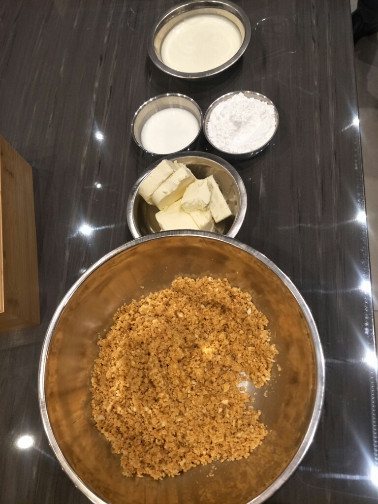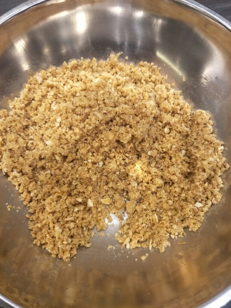 8. นำเนยละลายมาปั่นรวมกันกับแครกเกอร์ผสมให้เข้ากัน