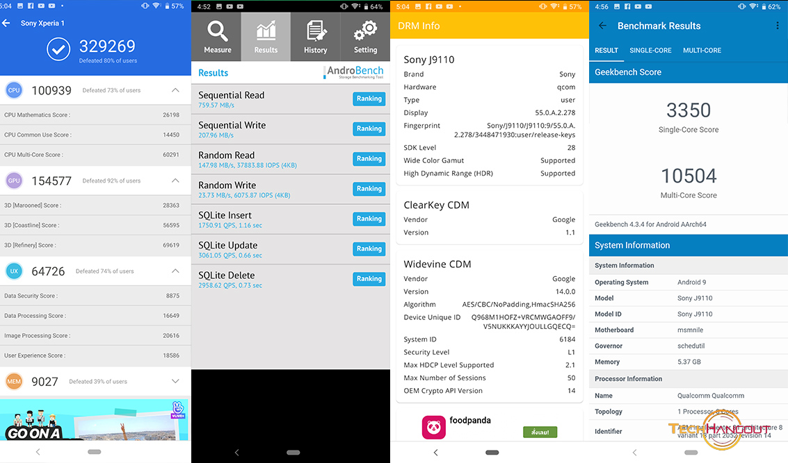 ทางด้านประสิทธิภาพในรุ่นนี้จัดเต็มมาพร้อมกับ CPU Snapdragon 855 ตัวล่าสุดมาพร้อมกับ RAM 6GB และ ทำคะแนน Antutu ไปได้ที่ 329269 คะแนนครับ ส่วนเรื่องของหน่วยความจำเป็นแบบ UFS 2.1 อ่านเขียนได้ที่ 759 MB/S และ 207 MB/s ส่วนเรื่องความปลอดภัยนั้นเป็น DRM L1 ตามปกติของค่ายนี้ครับ และ Geekbench นั้นทำคะแนนไปได้ 3350 และ 10504 คะแนนครับถือว่าทำได้ดีในภาพรวมแม้อาจจะไม่ได้คะแนนเวอร์มากนักแต่ในด้านการใช้งานจริงระบบจัดการของ SONY ทำออกมาได้ลื่นไหลและเสถียรมากๆอีกค่ายครับ