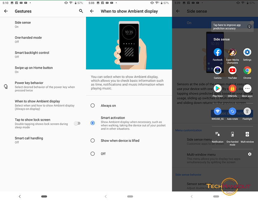 Gesture การควบคุมต่างๆนั้นก็ยังมีมาให้ค่อนข้างครบทั้งเรื่องของตัว SideSense ที่แตะขอบหน้าจอเครื่อง แต่รุ่นนี้ไม่ใช่จอโค้งแอบแตะยากมากๆ ไม่เหมือน XZ3 ส่วนเรื่องหน้าจอ Ambient ก็ยังมีมาให้และปรับแต่งได้นิดหน่อยครับ และแตะเพื่อดูหน้าจออะไรต่างๆรวมถึงตั้งค่าปุ่ม Power ในการกดเข้าทางลัดที่เราปรับตั้งได้เป็นต้น
