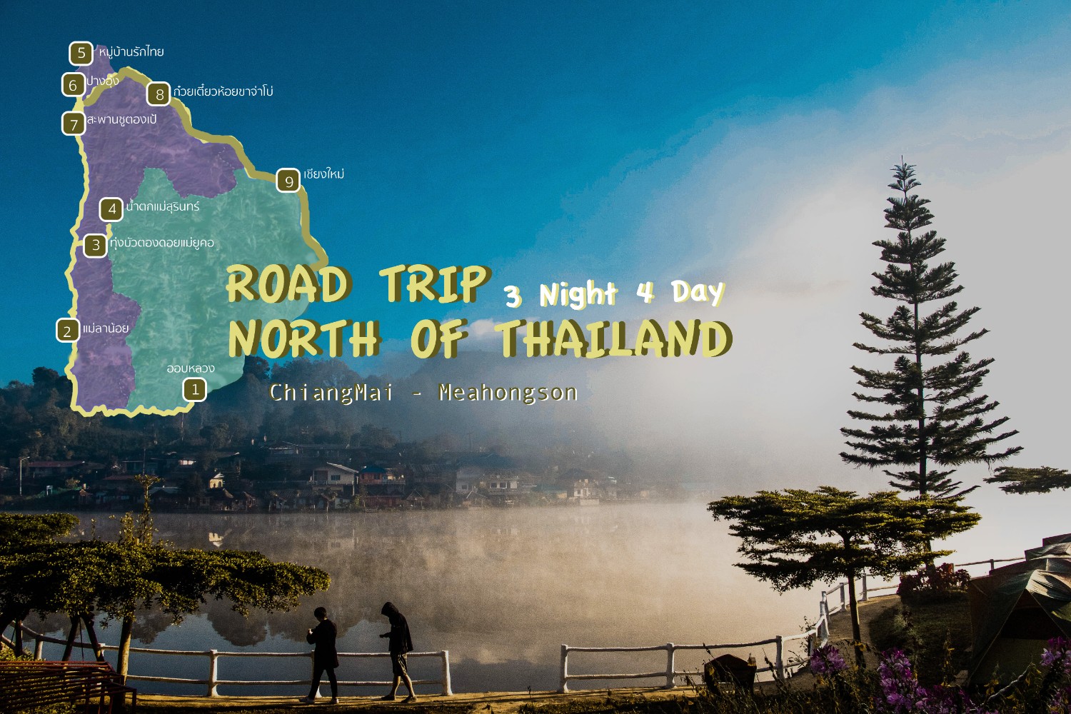 ตอนเช้าหลังจากชมหมอกหมู่บ้านรักไทยแล้ว ขับย้อนกลับลงมาชมวิวที่ ปางอุ๋ง และขับแวะสะพานตองชูเป้ มุ่งหน้าไปนอนเชียงใหม่แวะกินก๋วยเตี๋ยวห้อยขาจ่าโบ่ ( เส้นกลับเชียงใหม่โดยผ่านอำเภอปาย สามารถเปลี่ยนแพลนจากเชียงใหม่นอนที่อำเภอปายได้ )