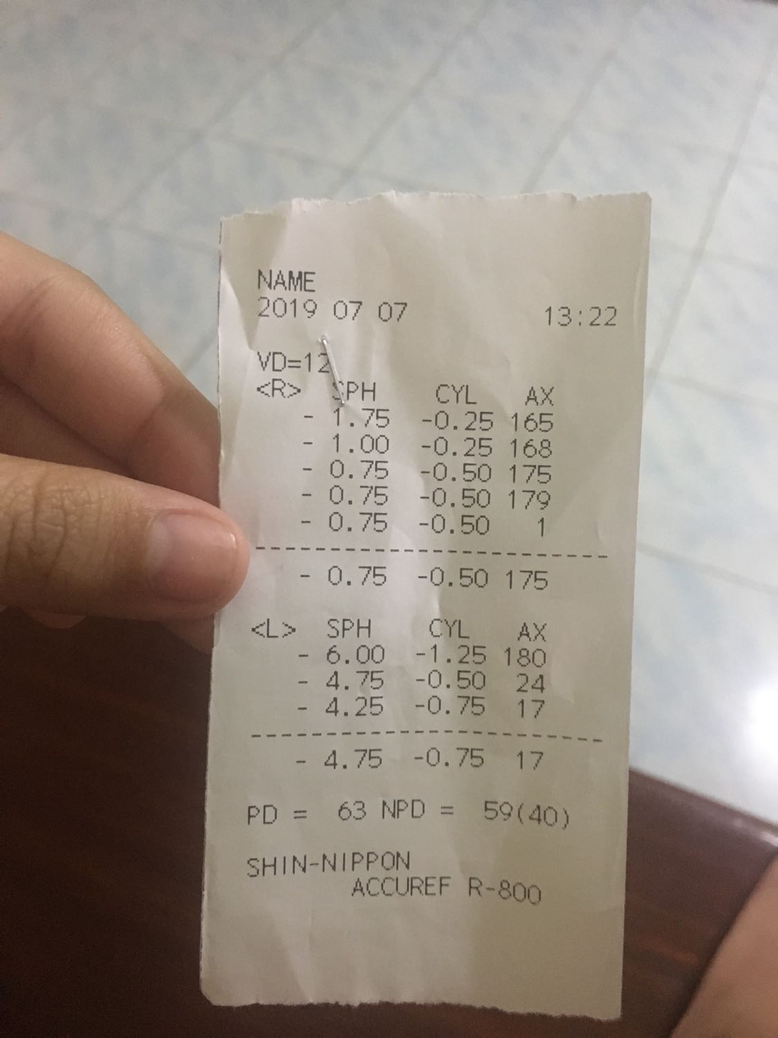 พอดีไปตรวจวัดสายตาโดยใช้เครื่องตรวจอัตโนมัติฟรีมามา แล้วมันก็มีสลิปมาให้ พอถามพนักงาน พนักงานก็แบบให้ไปตรวจกับอีกคน อารมณ์แบบจะให้เราซื้อแว่นอ่ะคะ เราเลยเดินออกมาพร้อมความงงๆว่าสรุปเราสายตาเท่าไหร่ ก็เลยตัดสินใจมาถามในนี้แหละค่ะ มีใครพอรู้ช่วยทีค่ะ สรุปเราสั้นเท่าไหร่กันแน่ ขอบคุณล่วงหน้าด้วยนะคะ