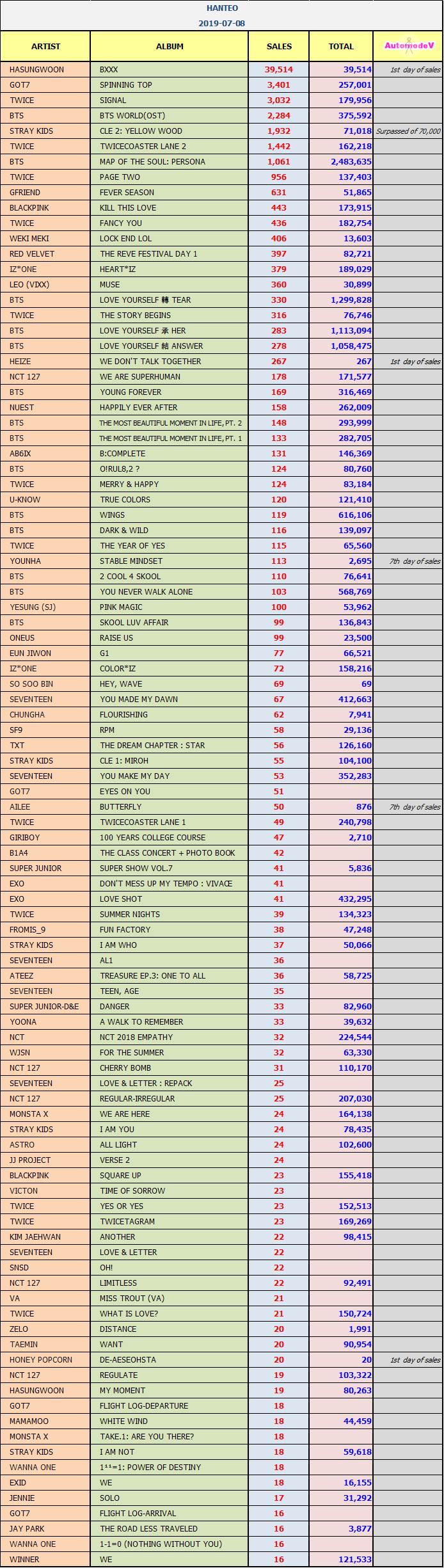ยอดซื้ออัลบั้มจากชาร์ต HANTEO 8 กรกฎาคม 2562