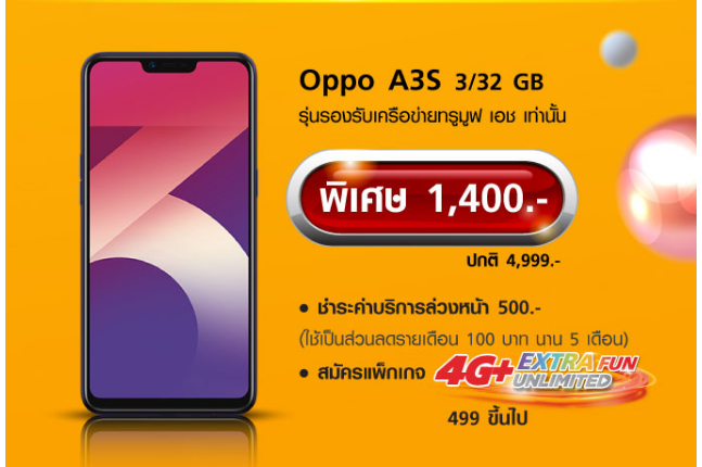 สำหรับเครื่อง OPPO A3s รุ่นรองรับซิมทรูมูฟ เอช ที่จดทะเบียนเท่านั้น ราคาพิเศษ 1,400 บาท จากราคาปกติ 4,699 บาท ส่วนลด 3,299 บาท ชำระค่าบริการล่วงหน้า 1,070 บาท นำไปหักค่าบริการรายเดือน 100 บาท นาน 10 เดือน โปรโมชั่นที่ร่วมรายการ OPPO Max Speed 499 / 4G Plus Extra FUN Unlimited 499 ขึ้นไป สัญญาการใช้งาน 12 เดือน